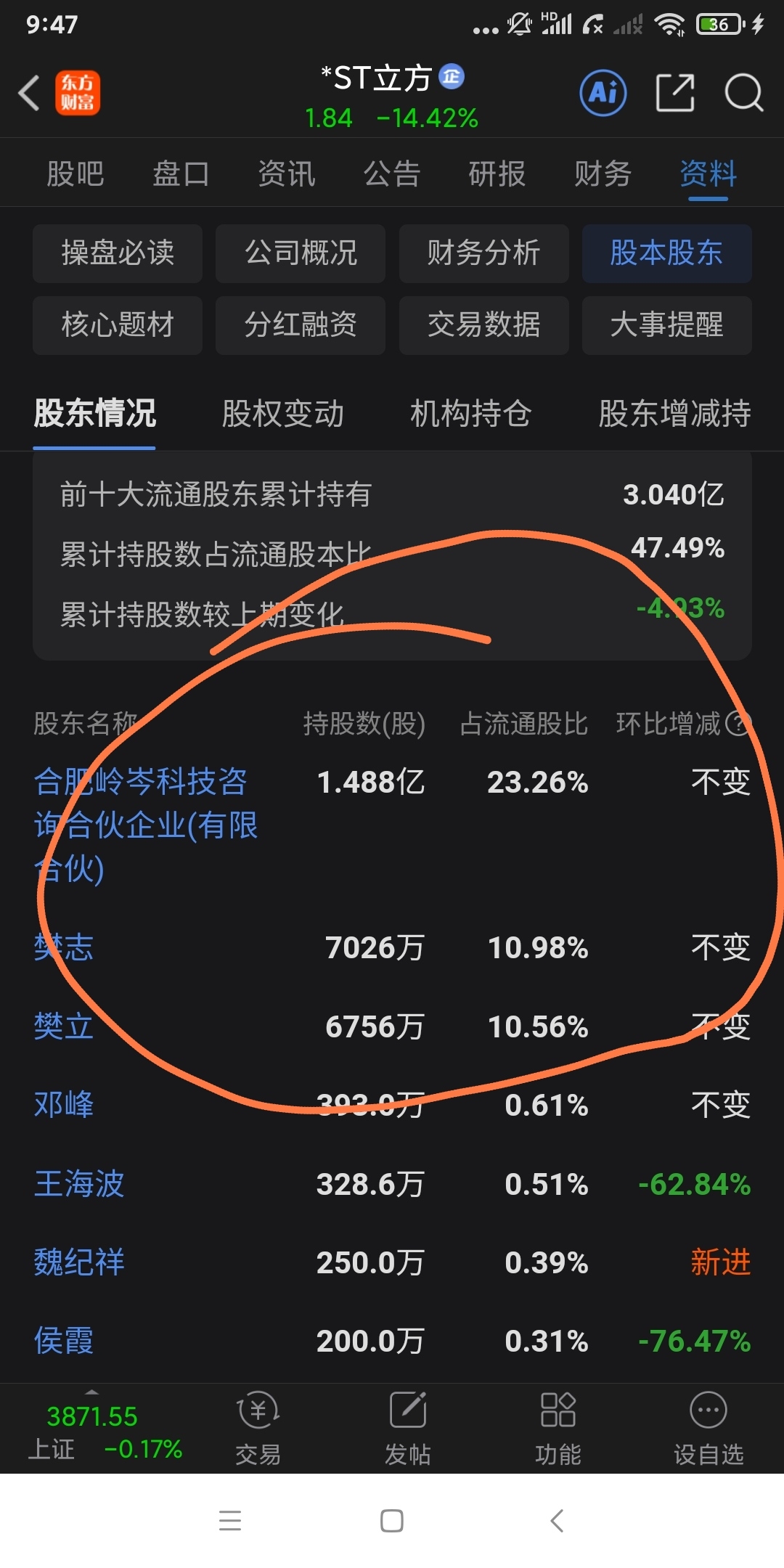 顶格补仓介入了!除去持股百分之5大股东3亿股,实际流通盘就3.55亿股,今天只要