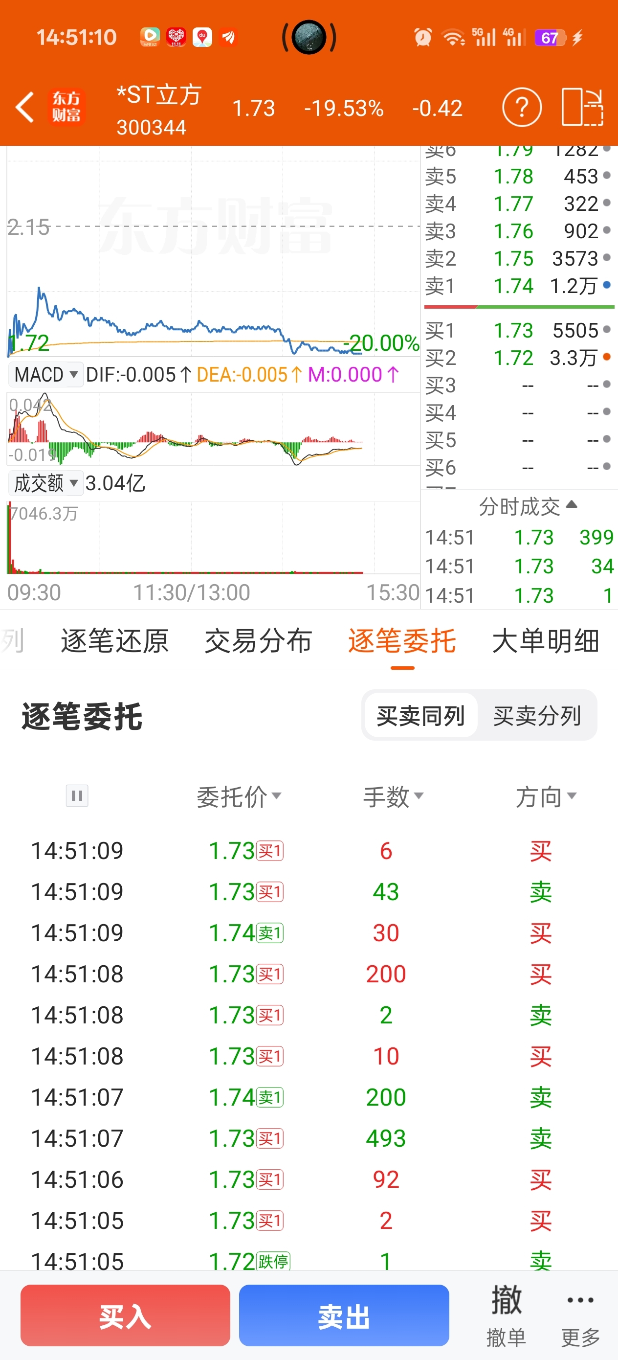 $*ST立方(SZ300344)$ 认死理,1.74肯卖1.73就是不卖。1.72又抢着排队。。马上下班了