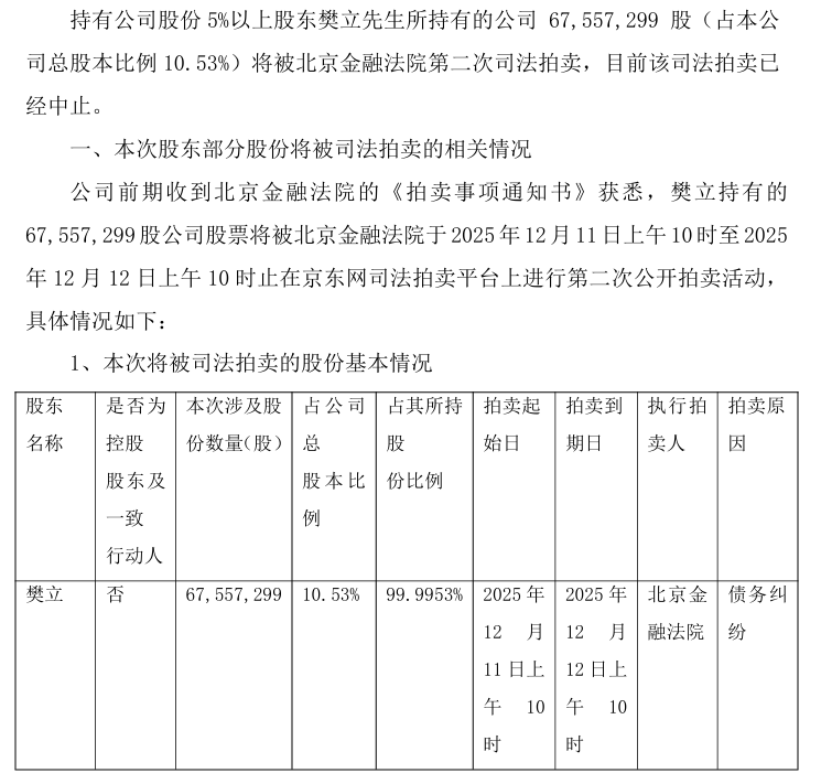 公告中提到,樊立所持股份的来源为首次公开发行股票上市前持有的公司股份,包括因资本公积转增股本、送股而相应增加的股份。此外,樊立的股份已累计被司法拍卖两次。