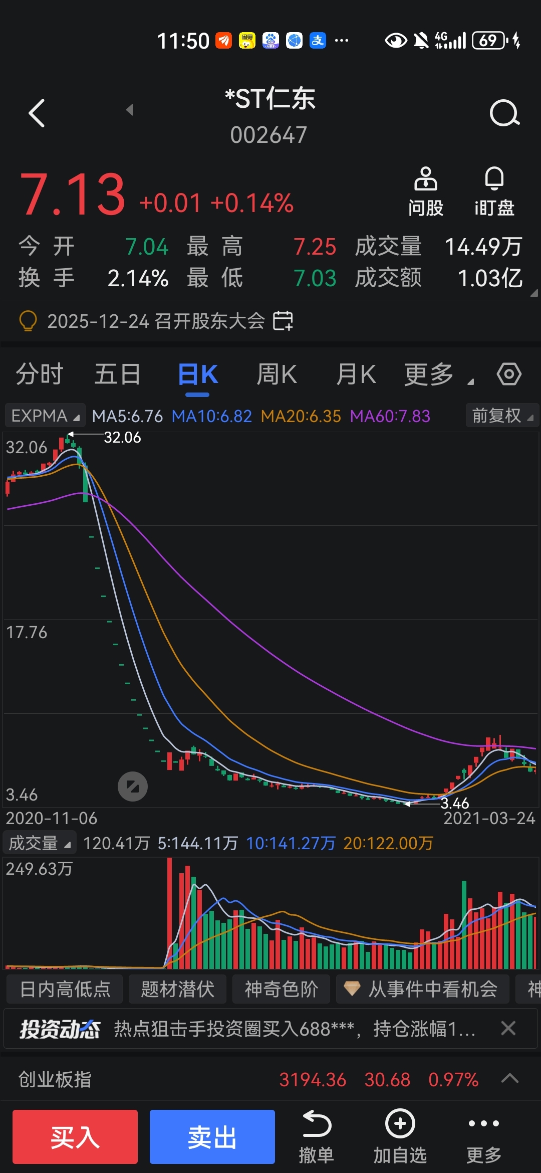 $*ST立方(SZ300344)$ 再看两个例子仁东和左江,左江为什么第一波只能跌倒20.60左右,看着还挺高的价格,不往下了,关键是从200左右到20跌幅比例已经到了10左右了,同理仁东从32.06到3.46,也到跌幅比例10左右了,下不去了,退市之前跌幅比例10到11就是跌幅极限了,一年里退市前,跌幅比例能到11左右,能找到的例子都不多,再看看立方跌幅比例已经10.9了