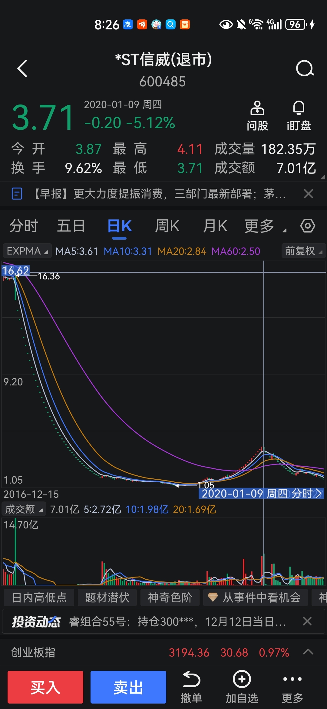 复盘发现了一个全市场短期跌幅比例最大的,信威,短期跌幅比例达到了惊人的15.58