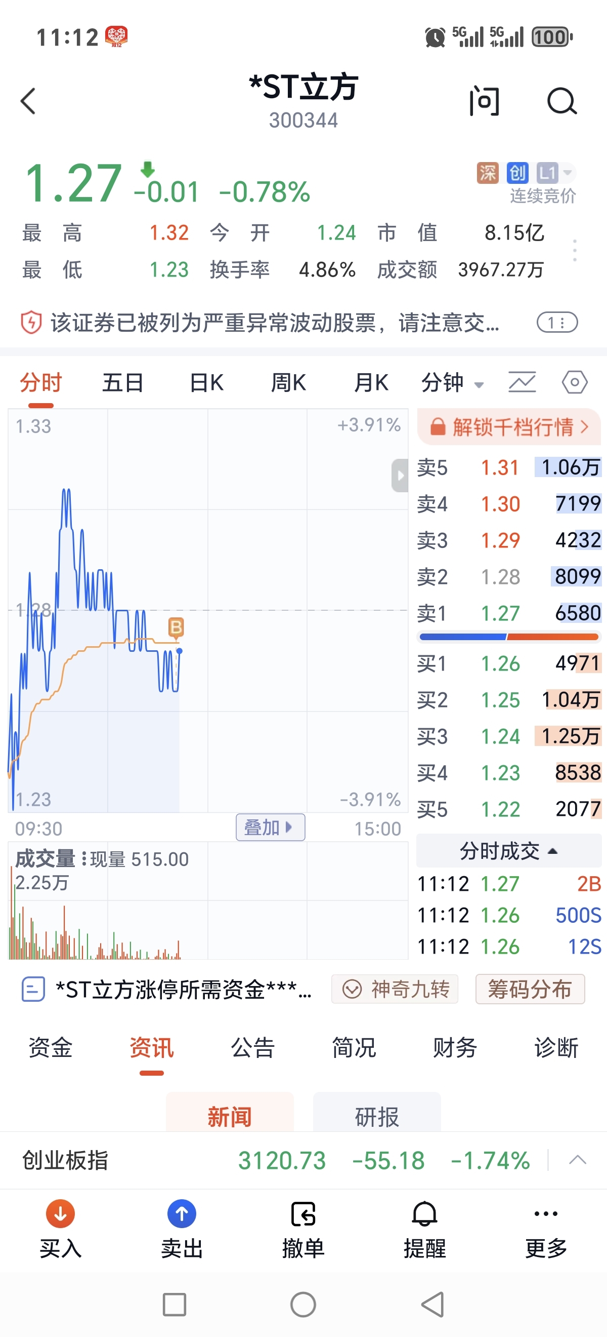 $*ST立方(SZ300344)$ 1.26元买入3万股,亏完也无伤大雅。赌一把。