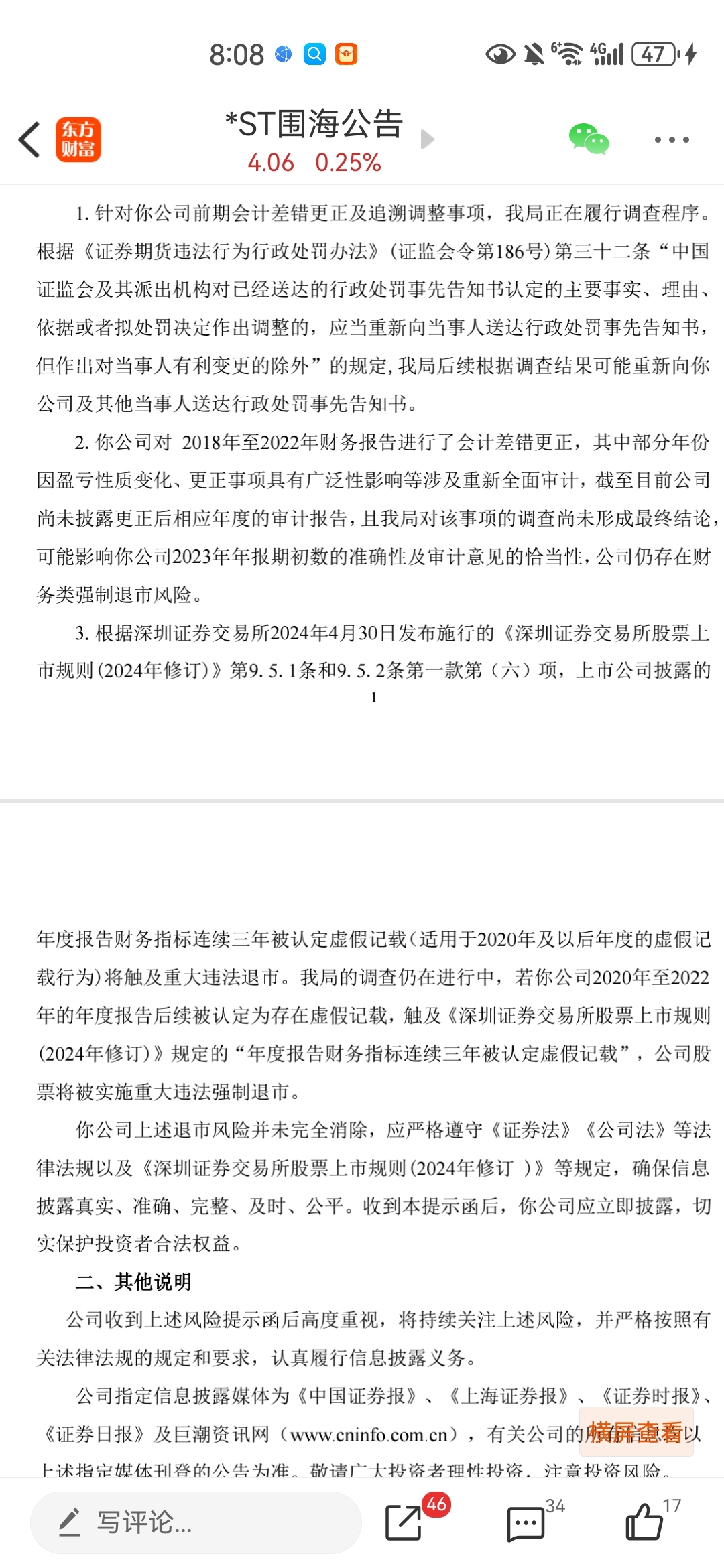 这个st围海,我看公告2024年5月5号的公告也出现了重大违法几个字,为什么这个