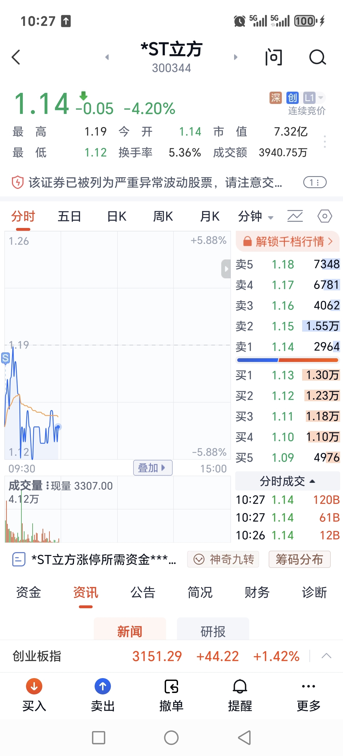 $*ST立方(SZ300344)$ 今天1.17元止损了,亏7分钱,为失误买单,市场不相信眼泪。