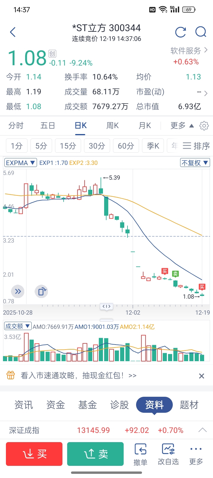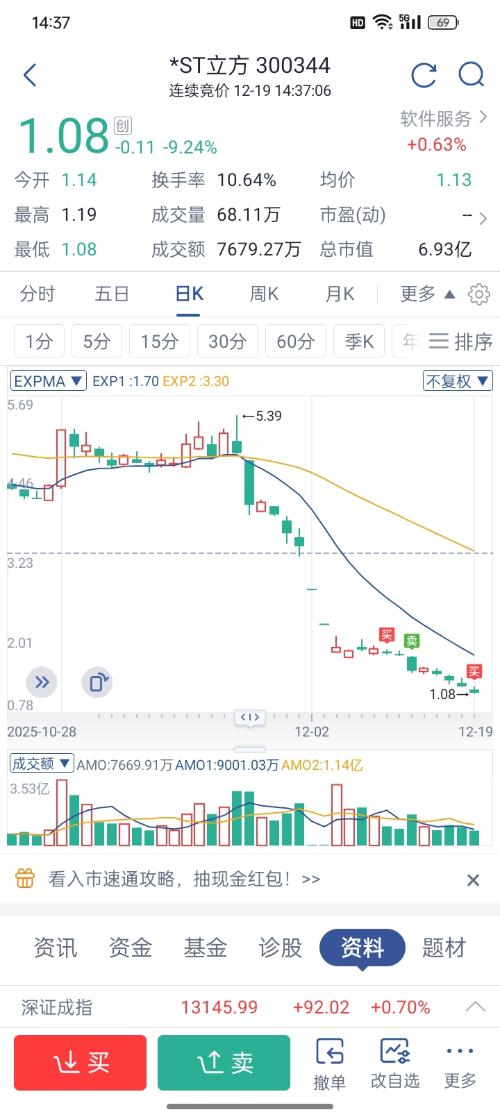 $*ST立方(SZ300344)$  最多1.18了,跑了