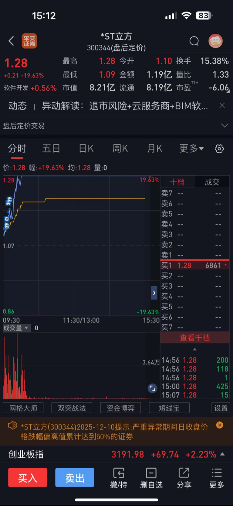 $*ST立方(SZ300344)$ 切记明天必须要出,周五说过的很清楚,1.07往下价格都给你们算好了,根据周五发的那张图,你们自己要计算清楚,3日上下30%,明日或许有20%的概率有溢价,这玩意绝对不能贪,我出的早根本不后悔,因为本人必须要抢先手,机会绝不留给主力。恭喜周五看图上车的朋友,周五说的非常明确,往下主力只会招来更凶狠的散户,下面明日出货的朋友紧跟步伐,st奥维。隔夜单挂地板价。