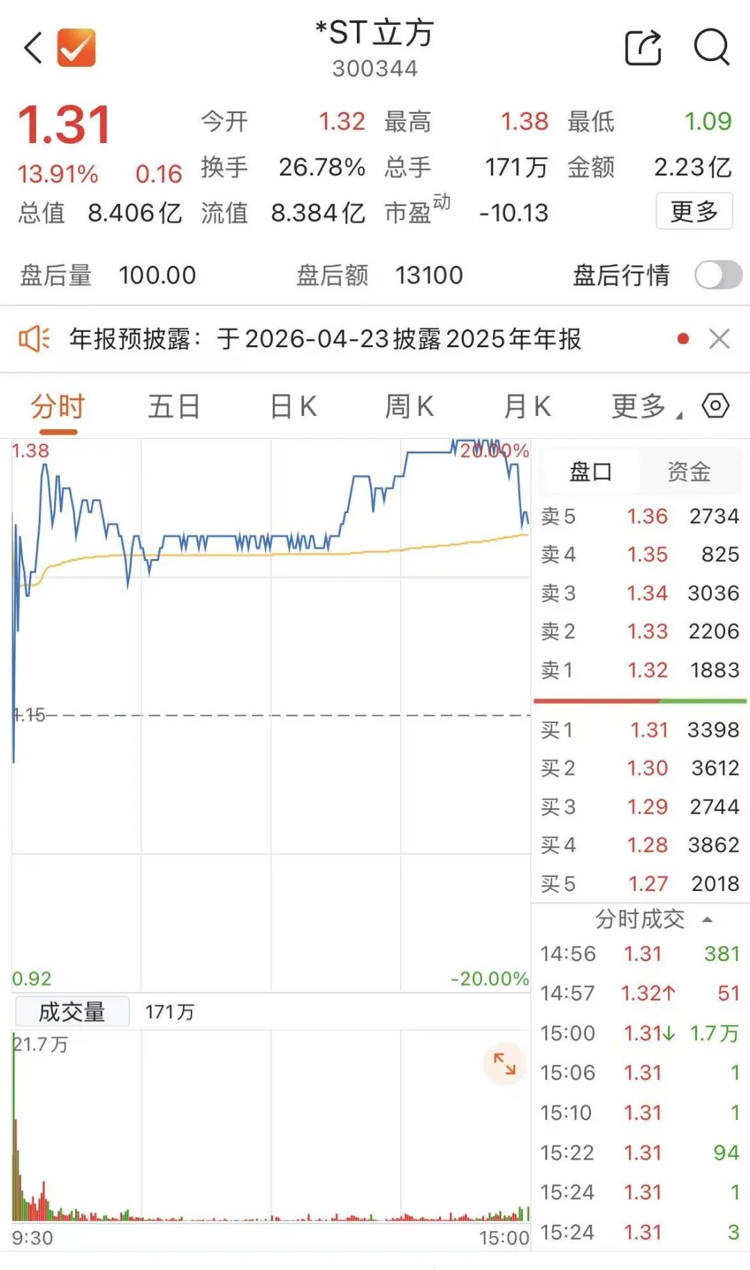 上证报记者关注到,1月13日至1月16日,*ST立方股价一路下跌,1月16日收盘价为0.67元/股。1月19日,*ST立方发布临停公告;1月20日,公司股票复牌后连续3个交易日逼近涨停;截至1月23日收盘,*ST立方涨幅为13.91%,股价报1.31元/股。