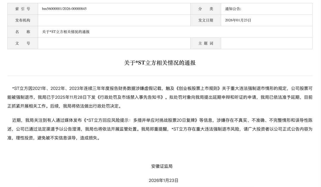 根据通报内容,*ST立方因2021年、2022年、2023年连续三年年度报告财务数据涉嫌虚假记载,触及《创业板股票上市规则》关于重大违法强制退市情形的规定,公司股票可能被强制退市,安徽证监局已于2025年11月28日下发《行政处罚及市场禁入事先告知书》。