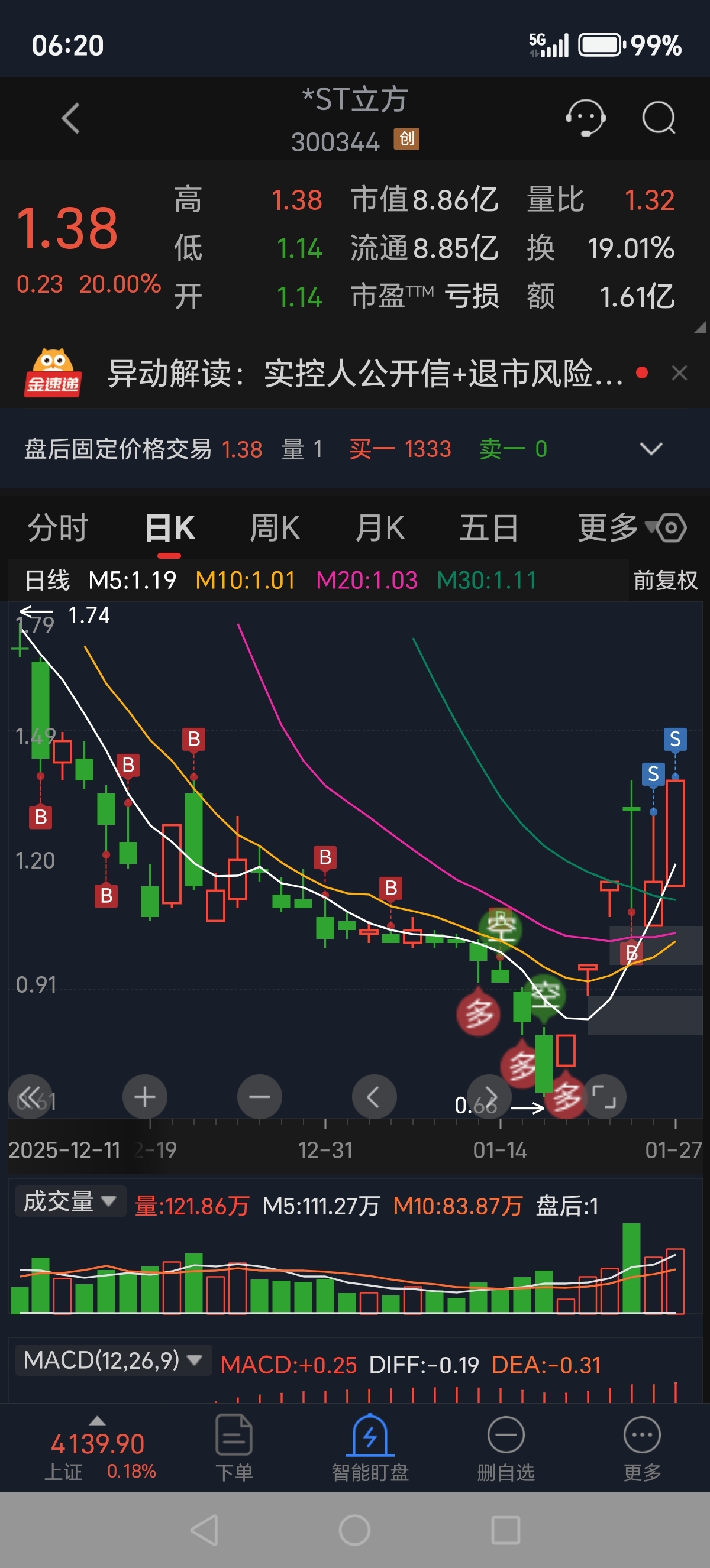 $*ST立方(SZ300344)$ 昨天我青仓了,也许买飞了