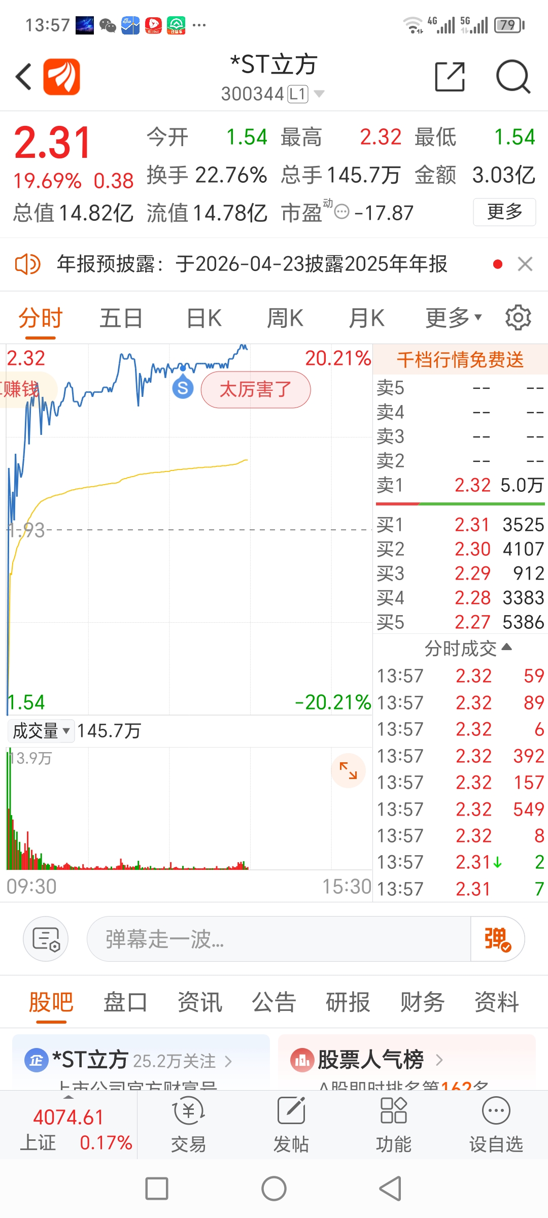$*ST立方(SZ300344)$ 太厉害了吧