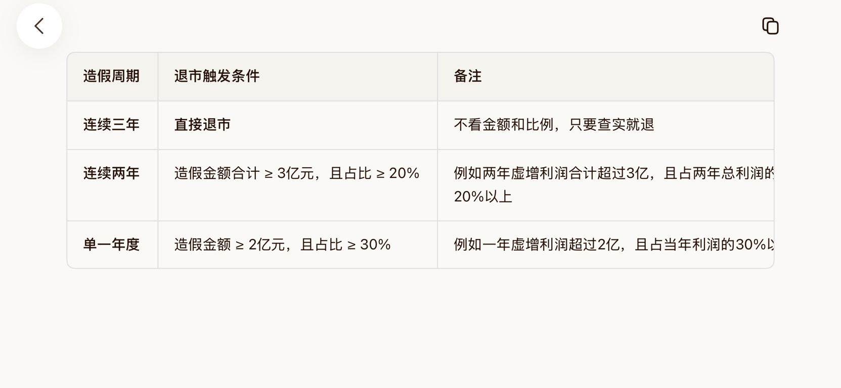 立方达到了吗?造假周期退市触发条件备注连续三年直接退市不看金额和比例,只要查实就
