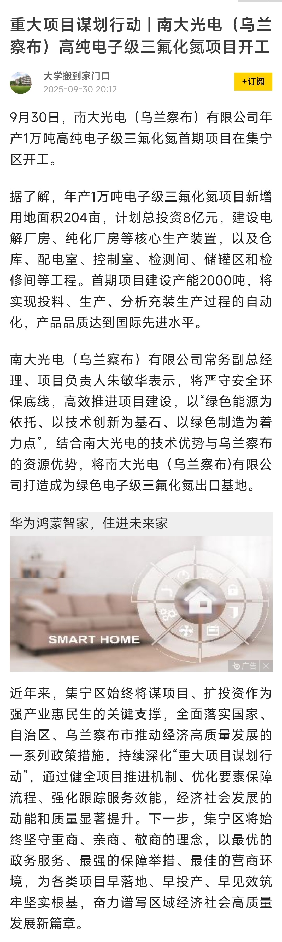 $南大光电(SZ300346)$ 突发特大利好!南大光电高纯电子特气项目9月30日开工!