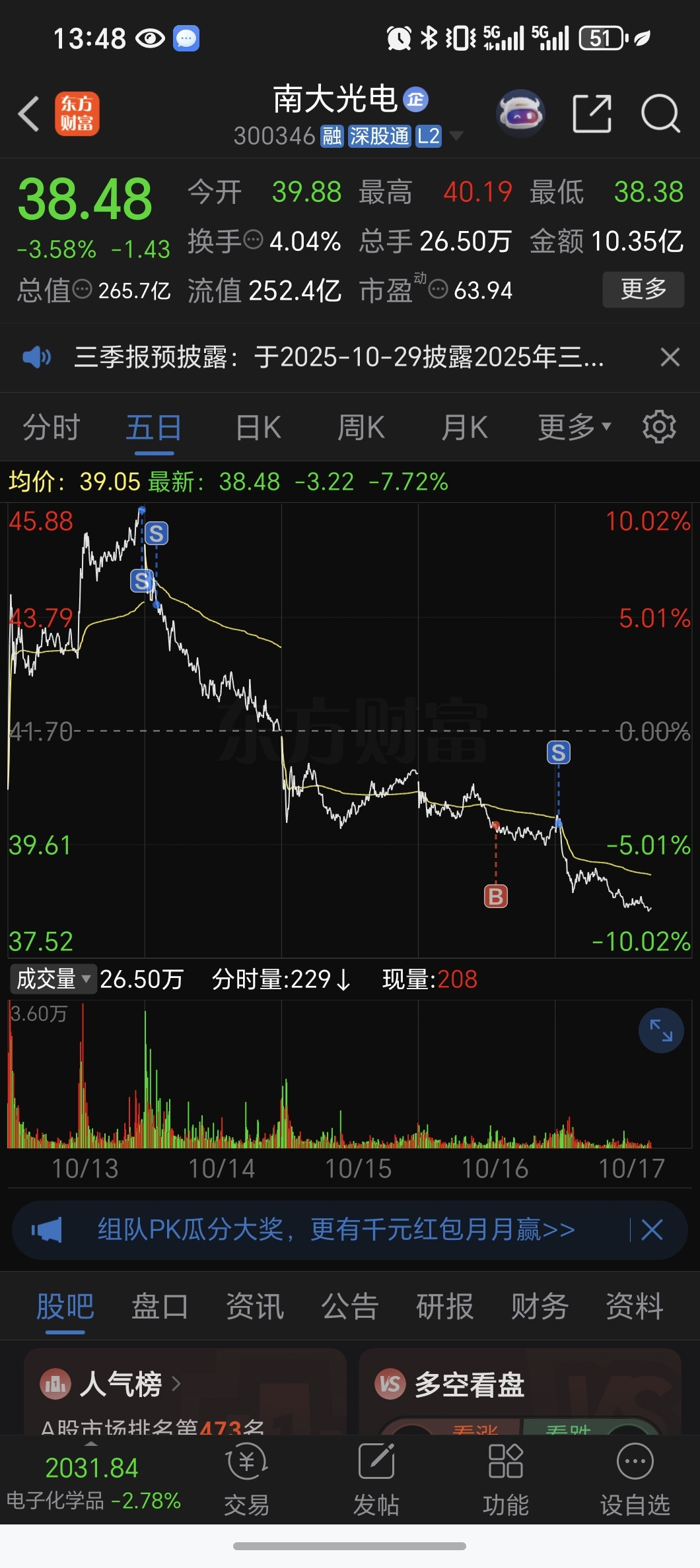 $南大光电(SZ300346)$ 额的个乖乖,4天时间,就跌的妈都不认识了,还好我溜得快,割韭菜你真的很擅长。。。