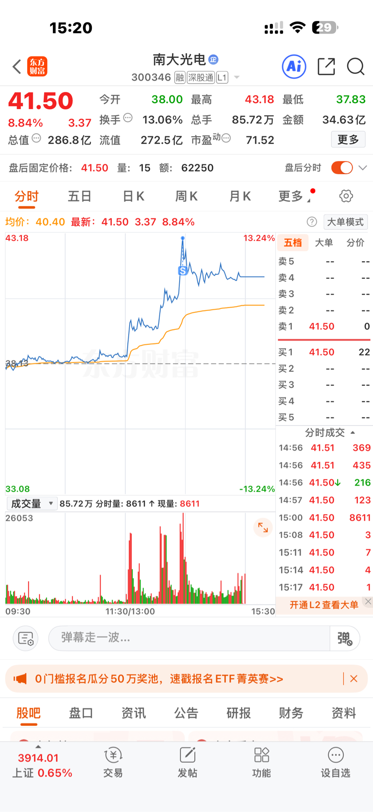 $南大光电(SZ300346)$ 前两天 41 进,今天 43 减三成#炒股日记#