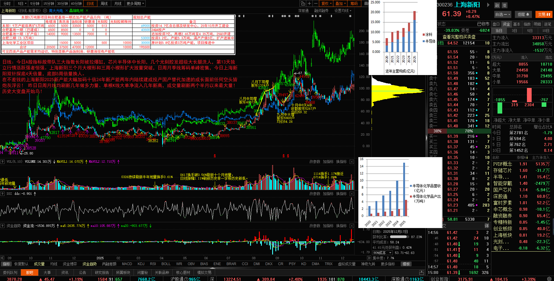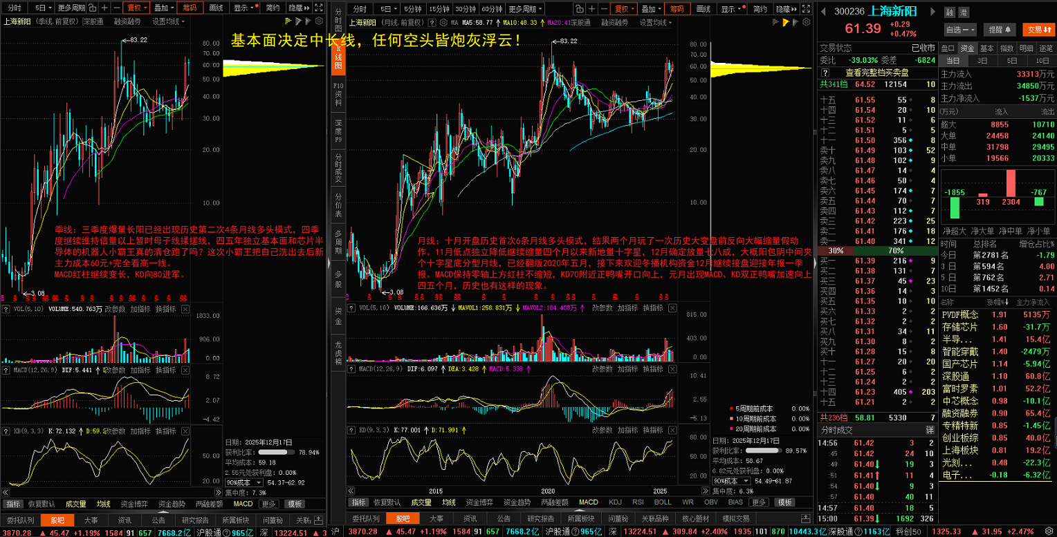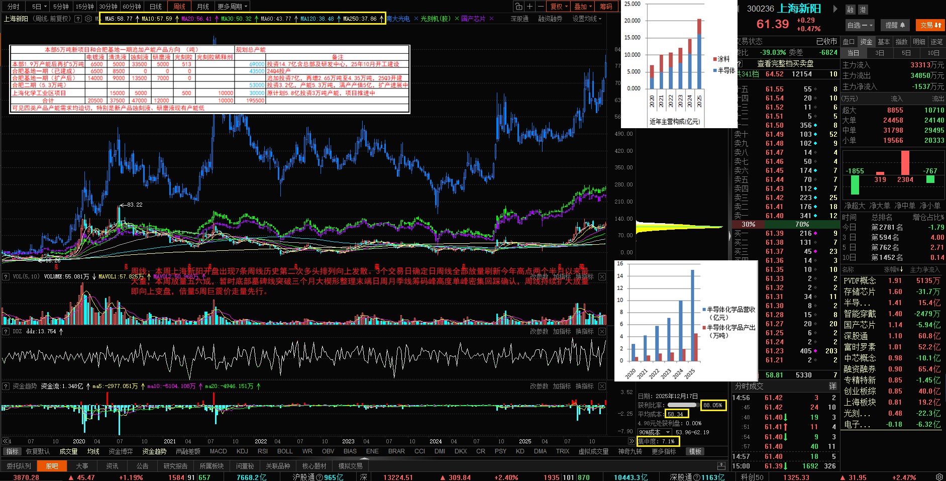 真光刻胶们超级大长腿,完成倒车接人,三周中长阳年度新高,假光刻胶上海新阳又把早盘追涨杀跌超大单一锅端,三周独立箱体端了三四个小波段。4天倍量5周底部倍量迎接历史第二次7条周线多头排列向上发散价走量先行!