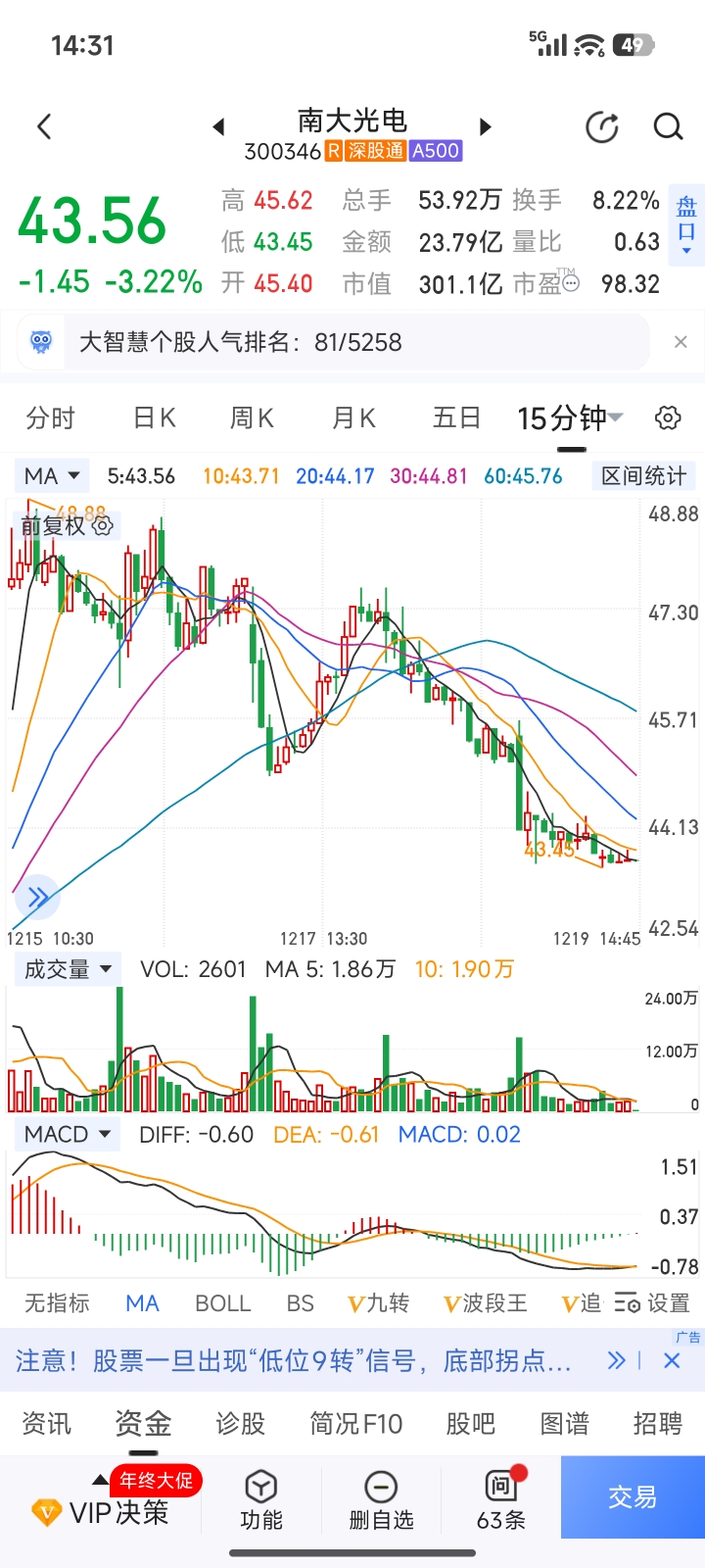 $南大光电(SZ300346)$ 看15分钟线,每隔15次一根大阴线带量下砸。已经连续砸了四次了。每一次下砸的成交量越来越小。预测下周一再砸一次,下砸的能量将没有了。最早下周一下午,最迟下周二,将迎来连续3~4天的反弹。