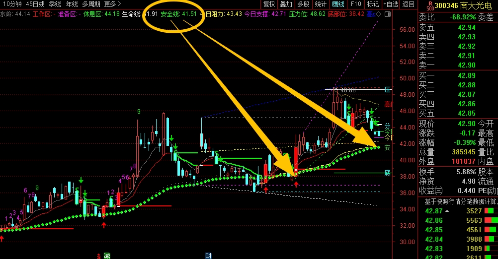 中期趋势相对稳健,一直沿着安全线震荡上行,因此短线重点就盯着脚底安全线41.51