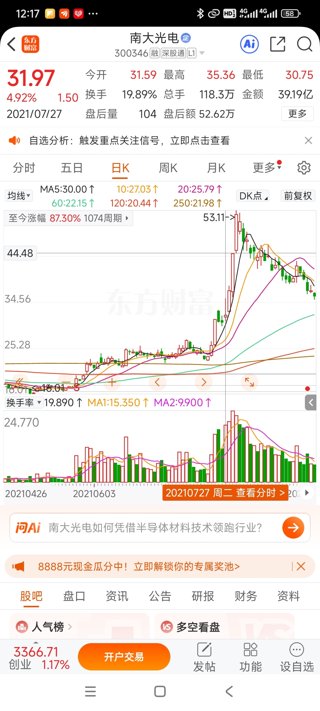 $南大光电(SZ300346)$ 大家看图形,和2021年那一拨,是不是一模一样的?今天阴线,后面三天有将近60%的涨幅