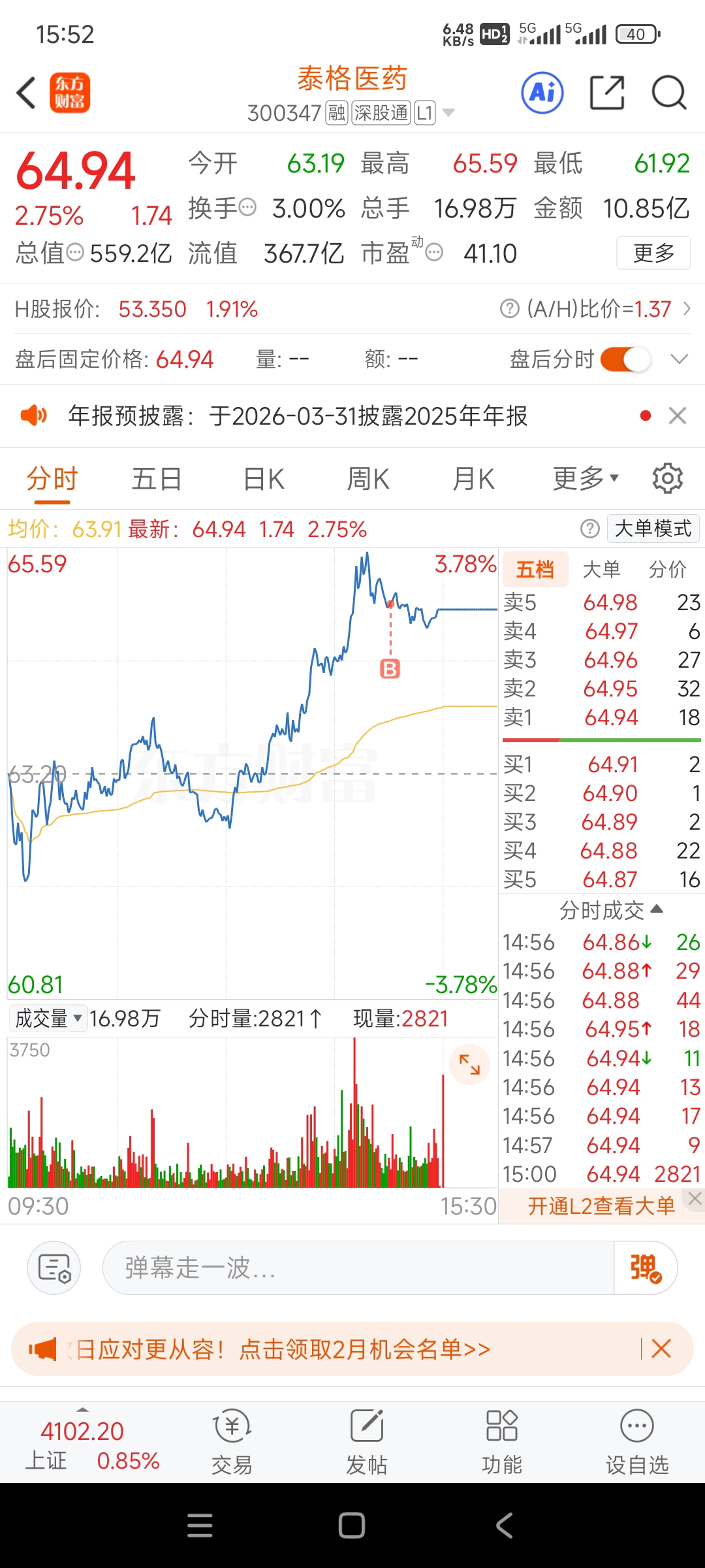 $泰格医药(SZ300347)$ 仓位0.5。成本65。买入逻辑,短线图形突破追涨,市场资金有高低切的迹象。预期,连阳加速新高。止盈,放量加速兑现。止损,反杀补缺,均线破位。预亏,10个点