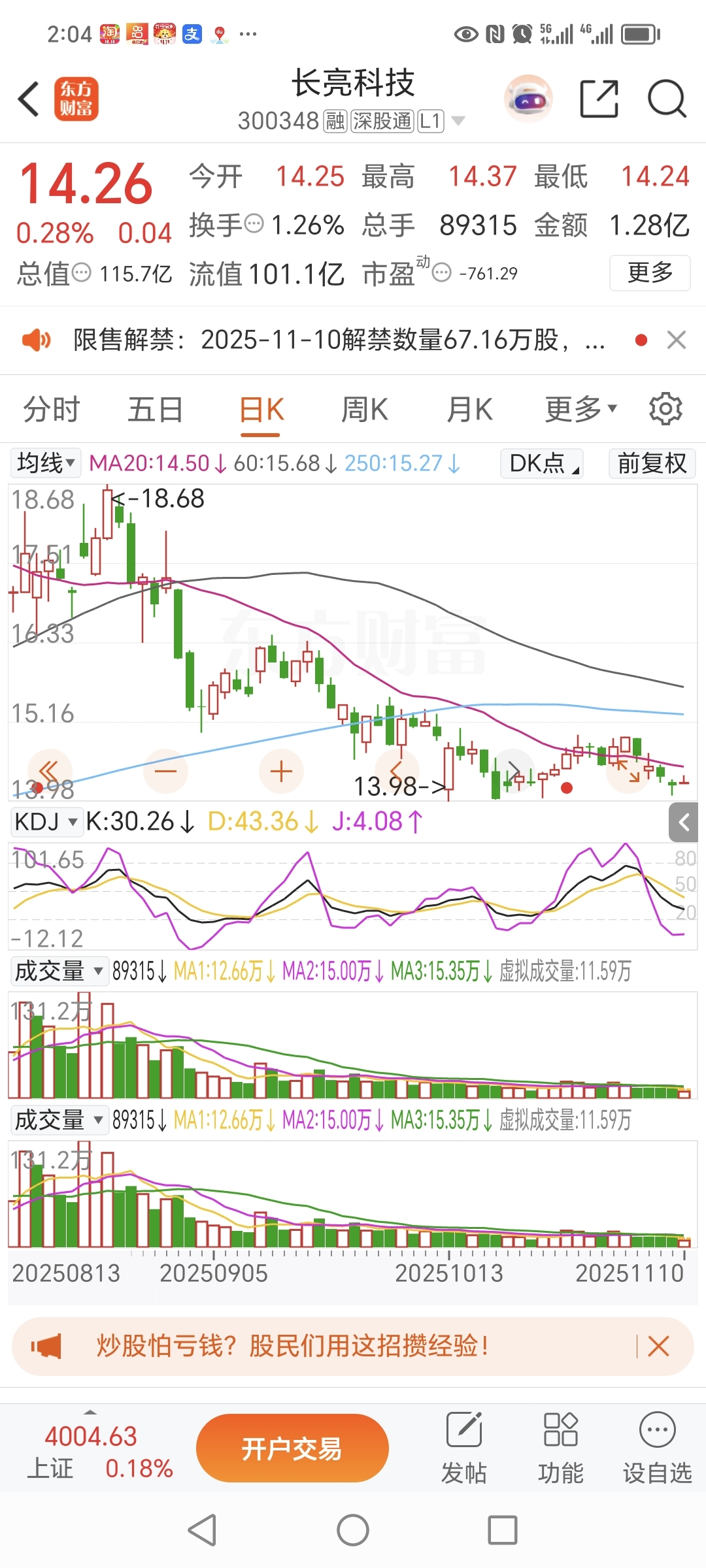 $长亮科技(SZ300348)$ 日线20日均线与60日均线开口继续张大,并无放量迹象,未见底,不宜加仓。