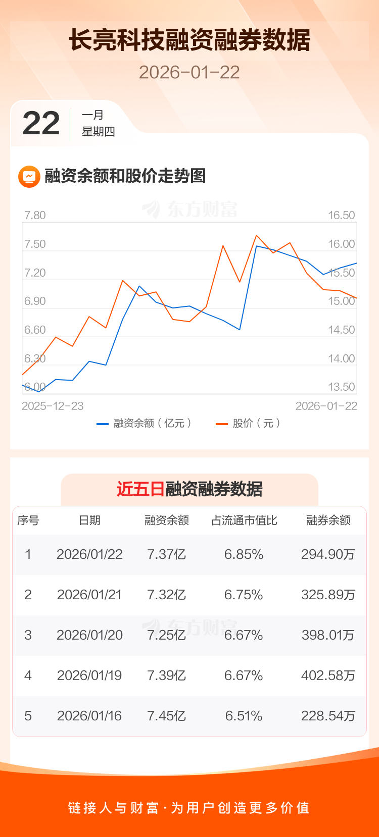 交易所最新数据显示,长亮科技于2026年1月22日获融资买入3123.50万元,融资偿还2616.69万元,当日融资净买入506.81万元。目前,该股融资余额7.37亿,占流通市值比例为6.85%。