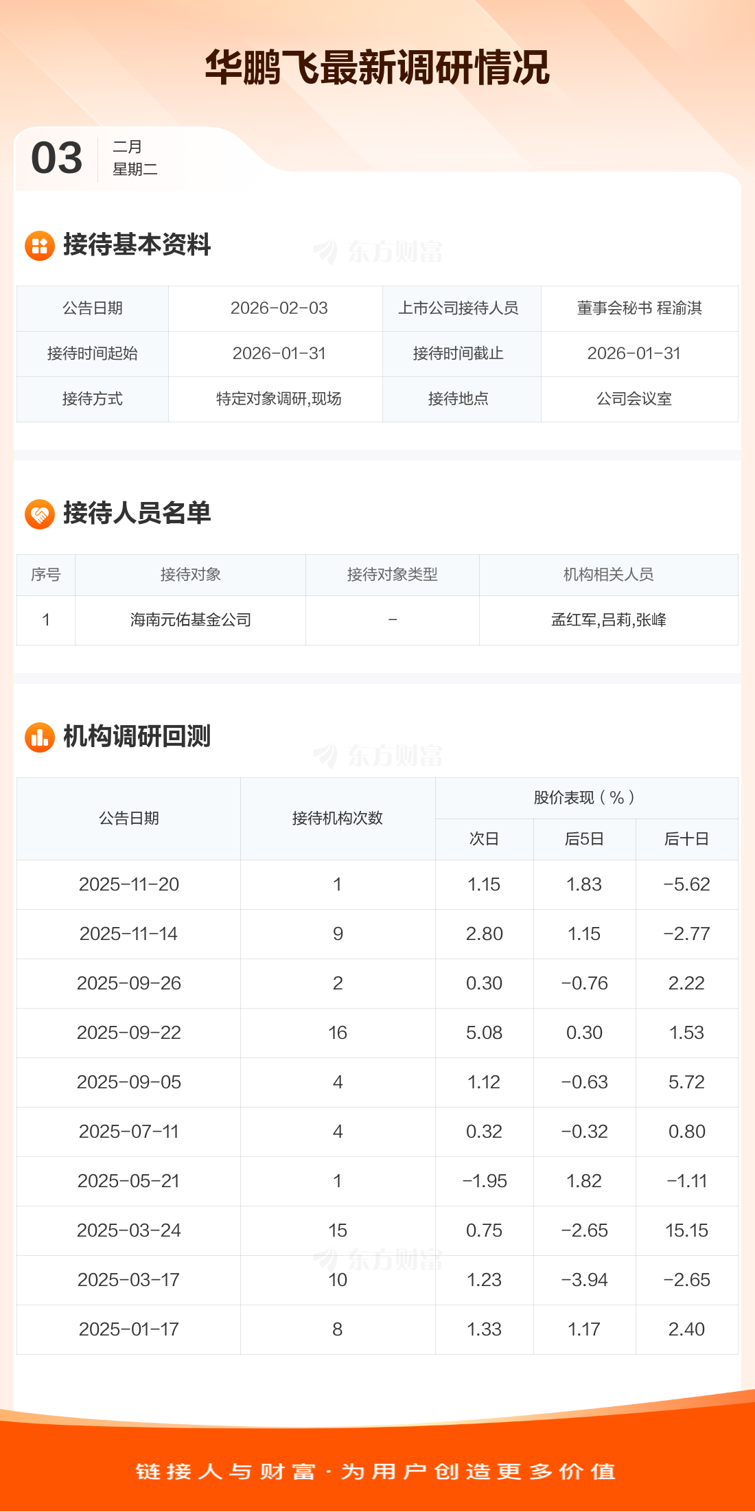 华鹏飞2月3日公告称,1月31日接待海南元佑基金公司等1家机构调研。接待人员包括董事会秘书 程渝淇。