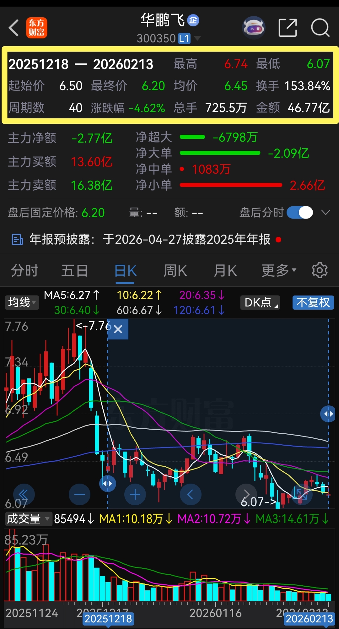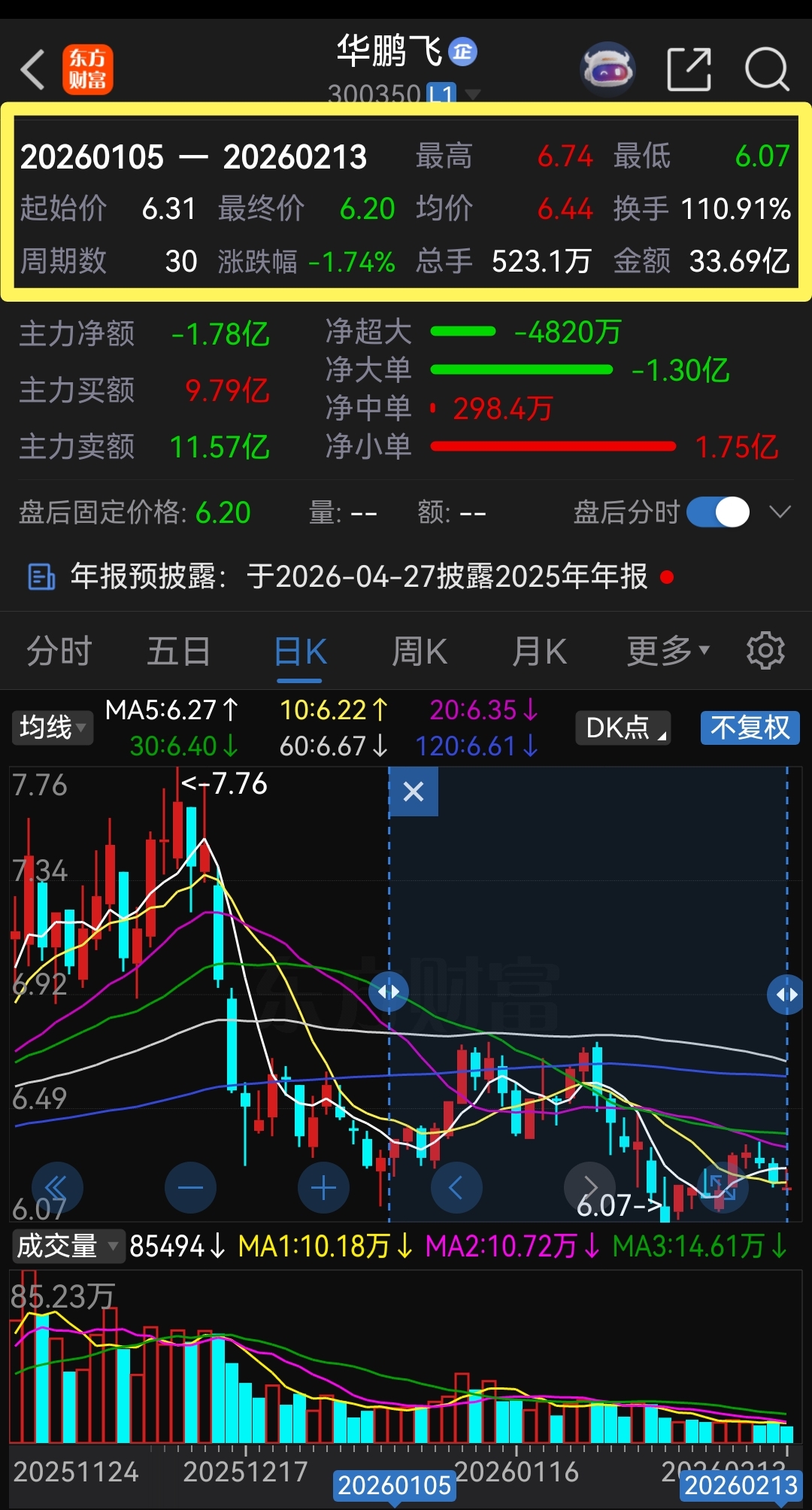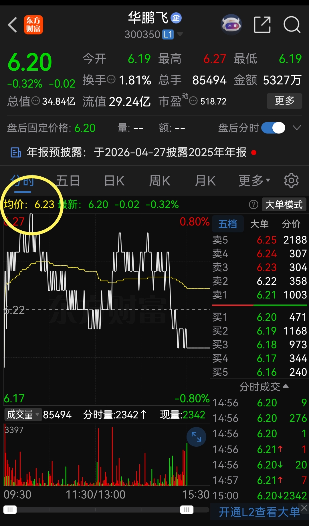 收盘价低于全天成交均价6.23元,逢低买入布局待涨为最佳策略!提供60个交易日内