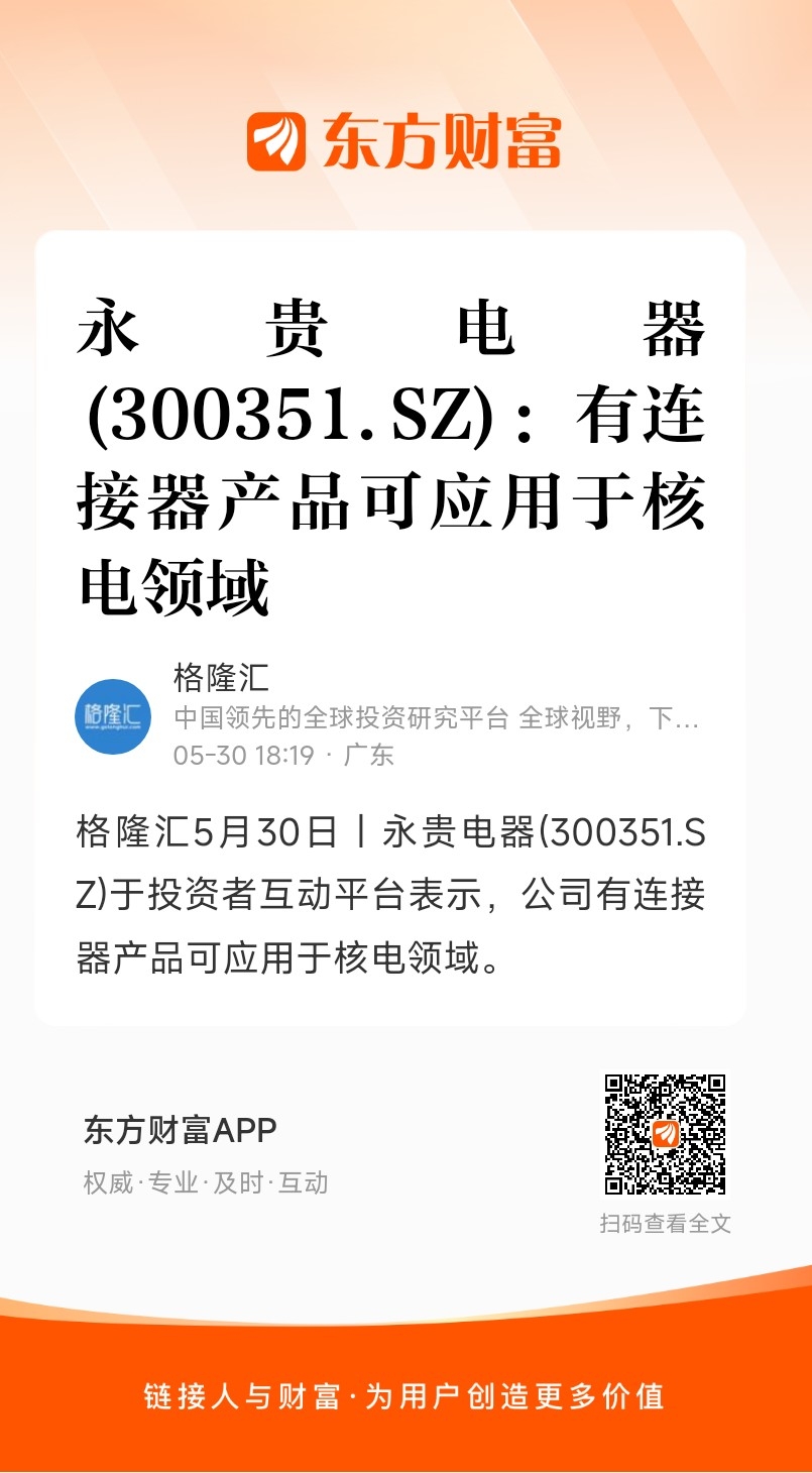 $永贵电器(SZ300351)$ 2025年5月30日,永贵电器在投资者互动平台表示,公司有连接器产品可应用于核电领域。此外,其全资子公司洛阳奥联光电科技有限公司深耕特殊环境光信息传输(核能、真空耐辐照)等技术领域。另一家子公司四川永贵科技有限公司在核电领域也有一定市场份额,其产品涉及核用连接器等。