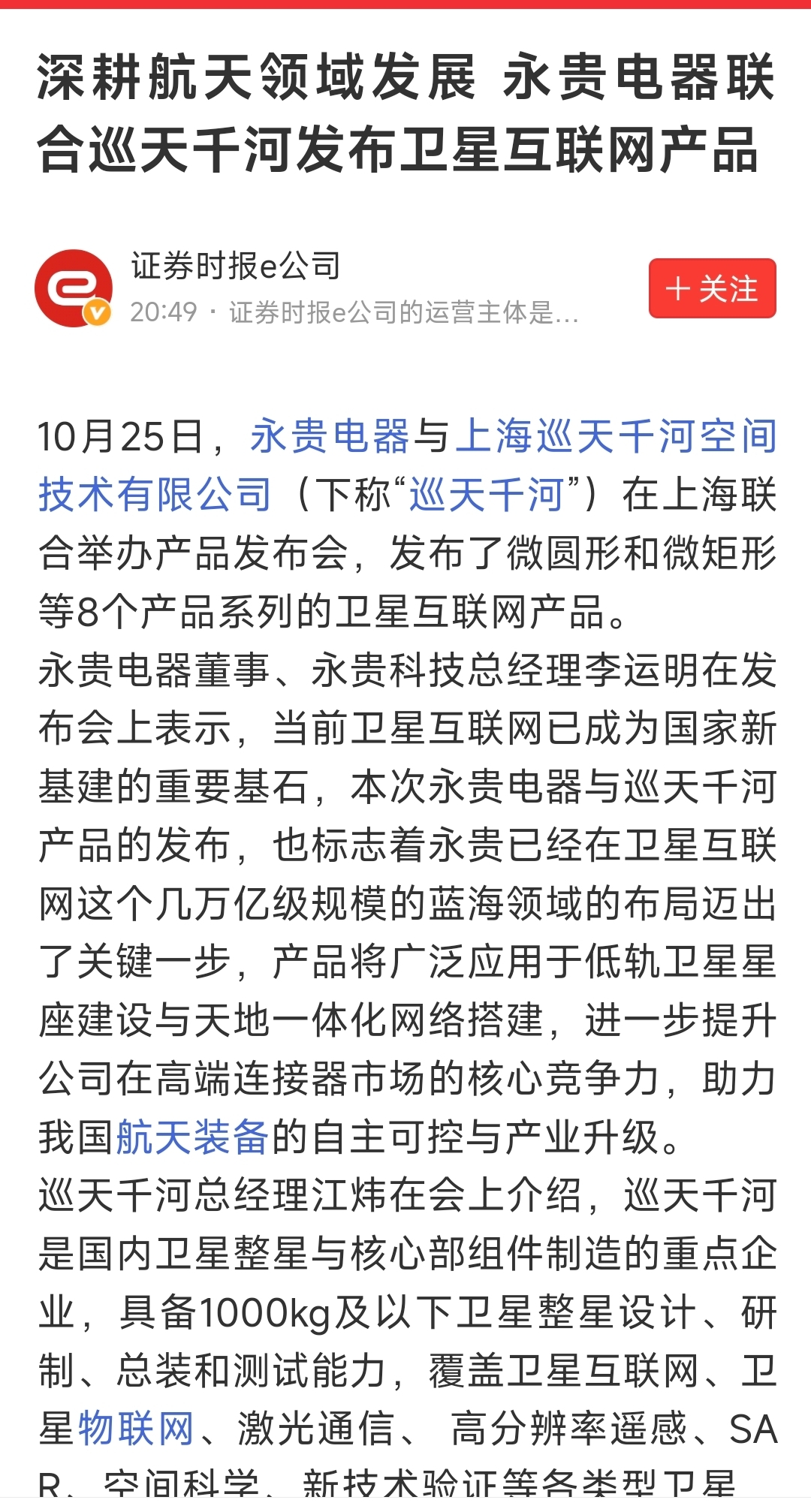 $永贵电器(SZ300351)$ 万亿航天,厉害