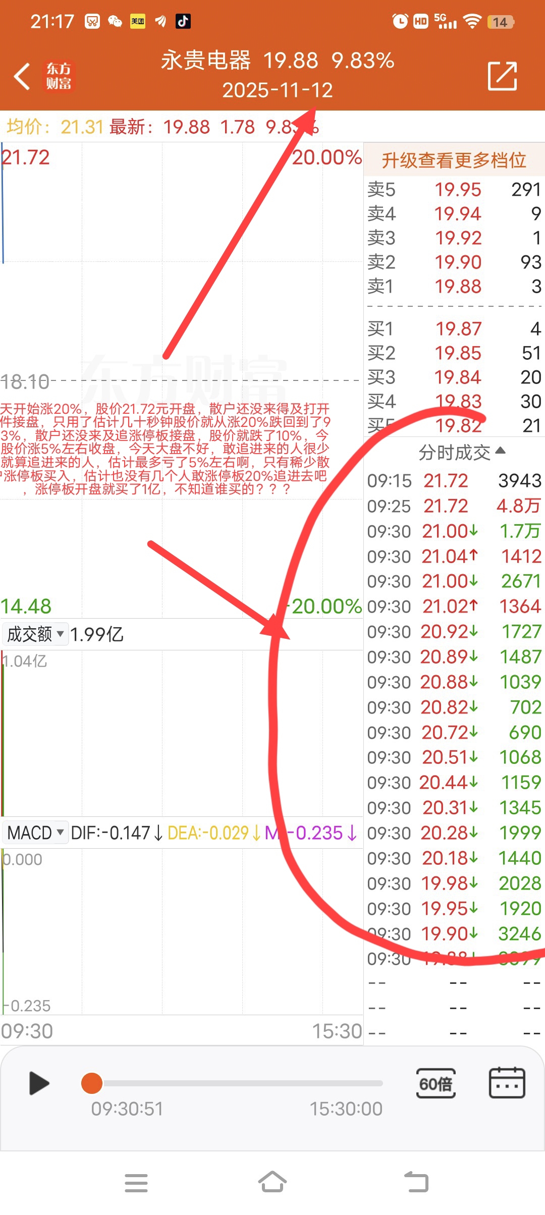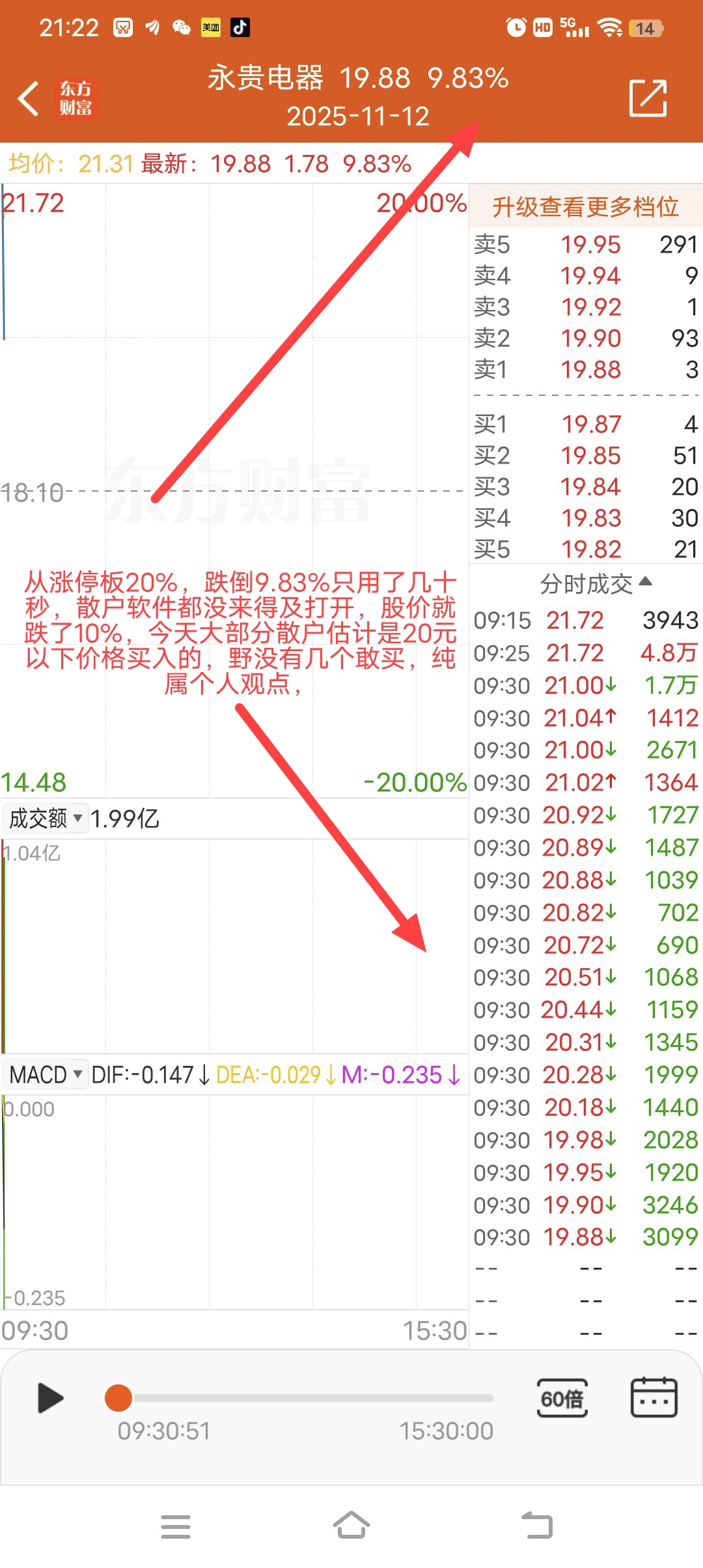 $永贵电器(SZ300351)$ 估计底部获利盘散户老司机赚盆满钵满全跑光了,散户开盘软件都没有打开,股价就从21.72元,只用了几十秒,股价跌倒了20元以下了,散户也没有几个能20原来以上接盘,接盘的估计今天也最多亏5%而已,如果明天高开6%或者8%开盘,估计反包涨停的可能,,