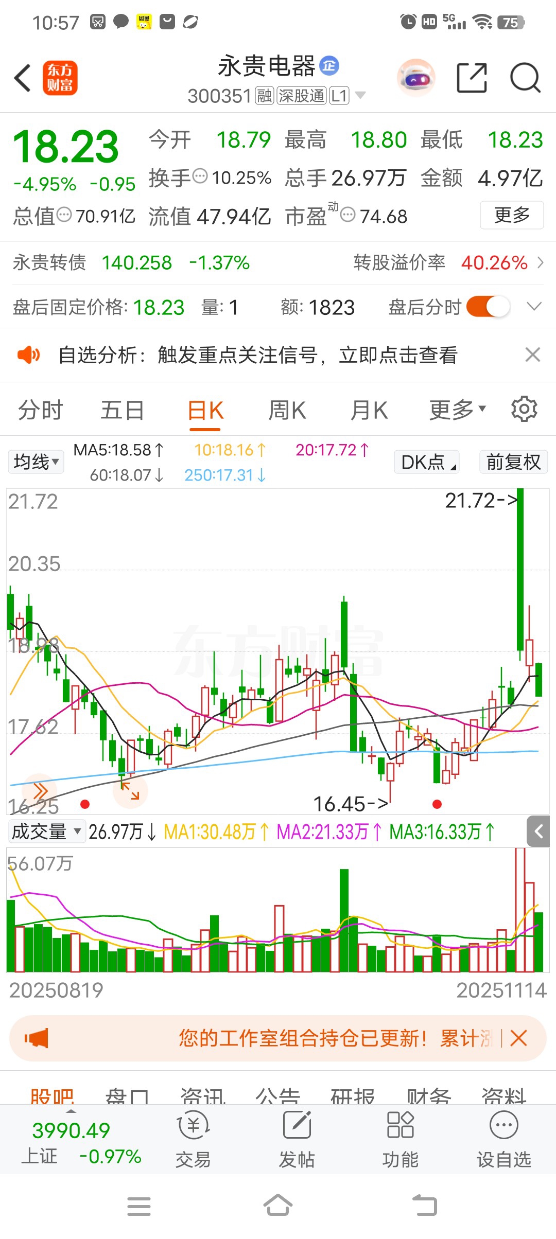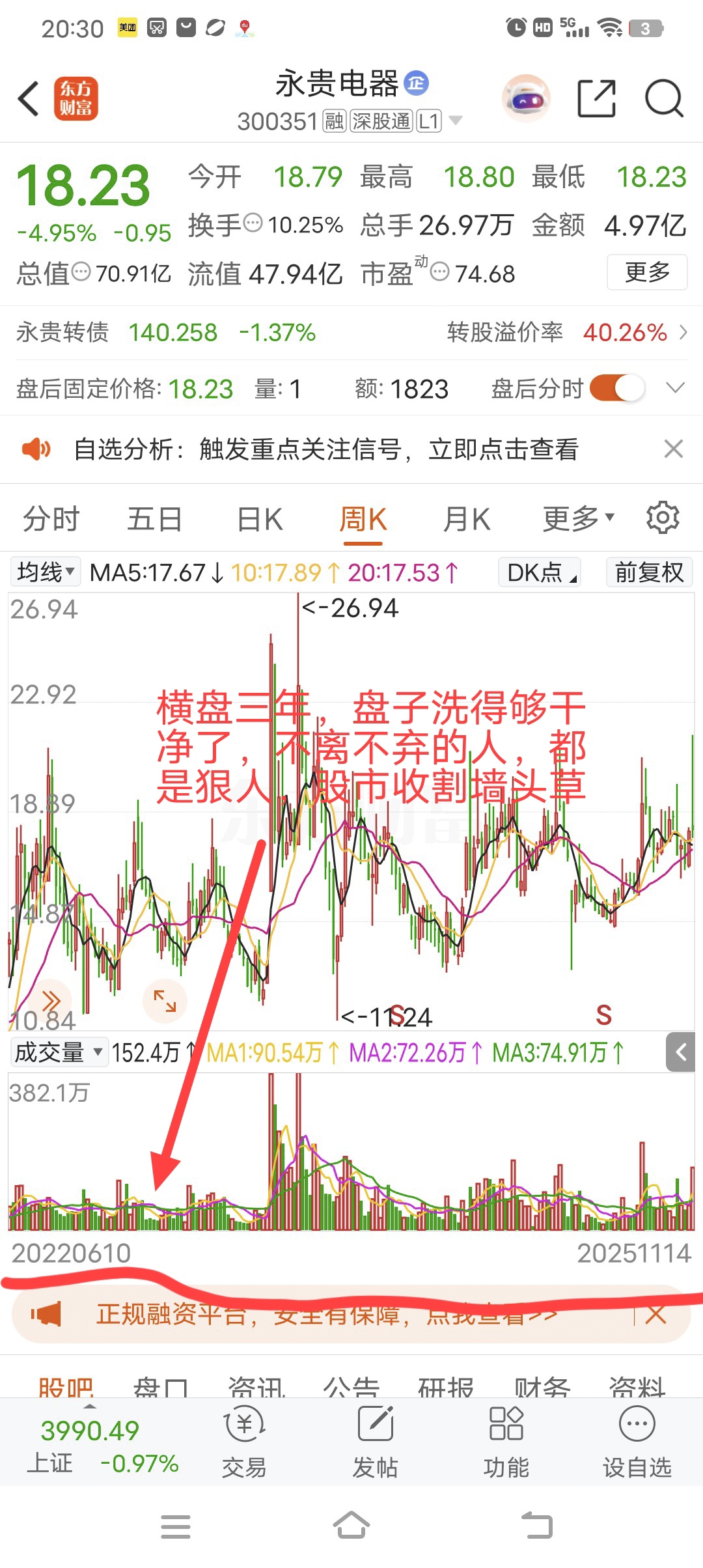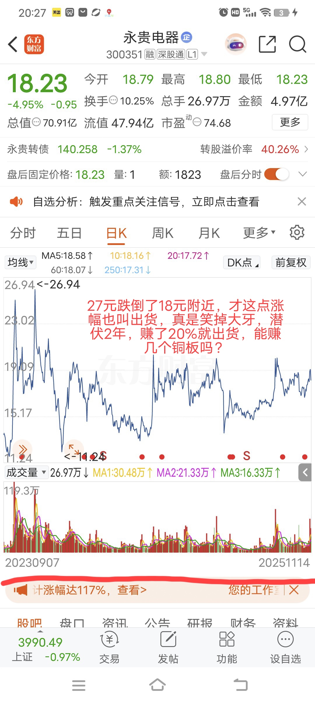 $永贵电器(SZ300351)$ 大鳄潜伏在水底,它一偶尔动一动,,,敢一字板涨停的都是庄家所为,只是庄家强弱问题,至少肯定的,这股有庄家,只要确定了有庄家了就好搞了,就怕股票没有庄家,只要有庄家,股价下跌也只是洗盘而已,股价跌的越多,庄家也就亏得越多,散户唯一的方法,就是等待合适的时机进去潜伏几个月或者半年,等庄家再次启动,,,,