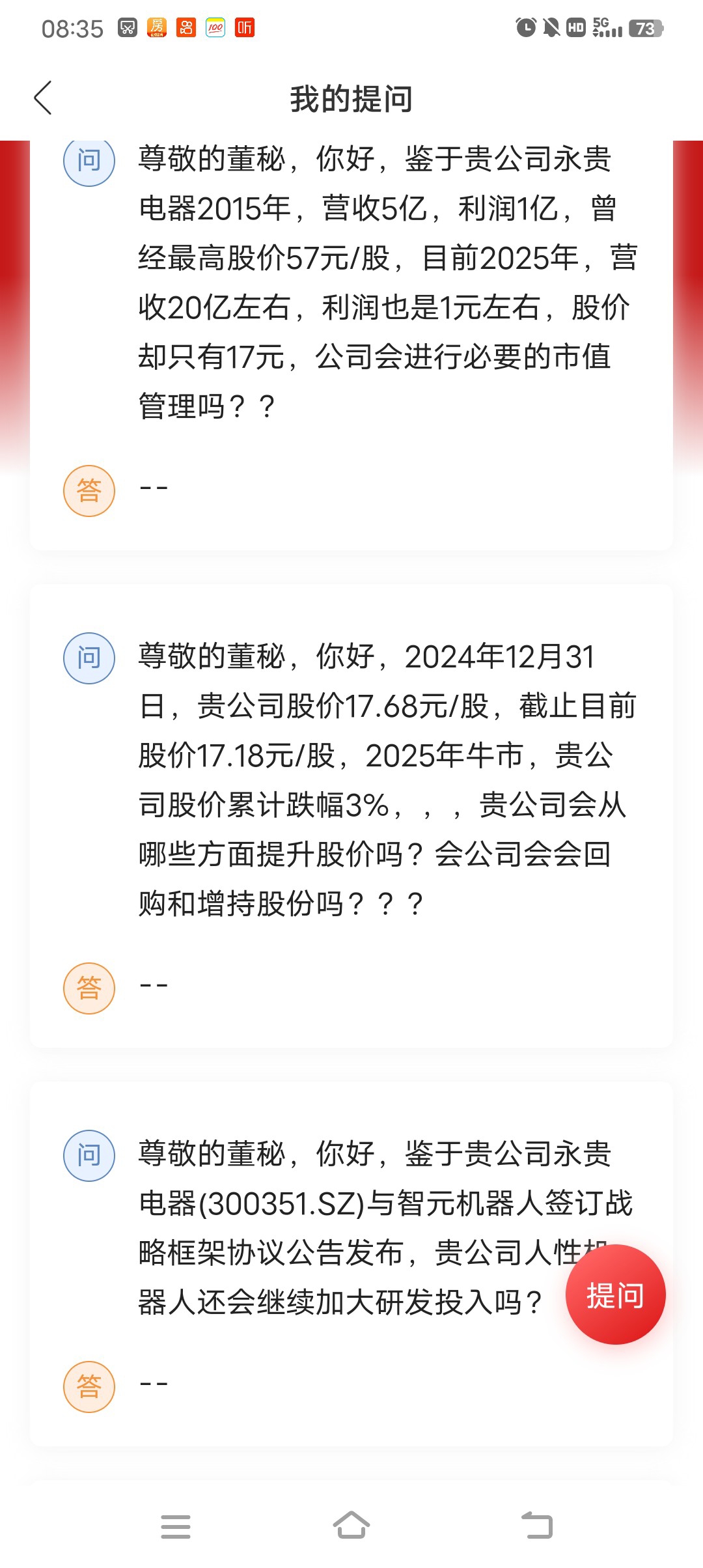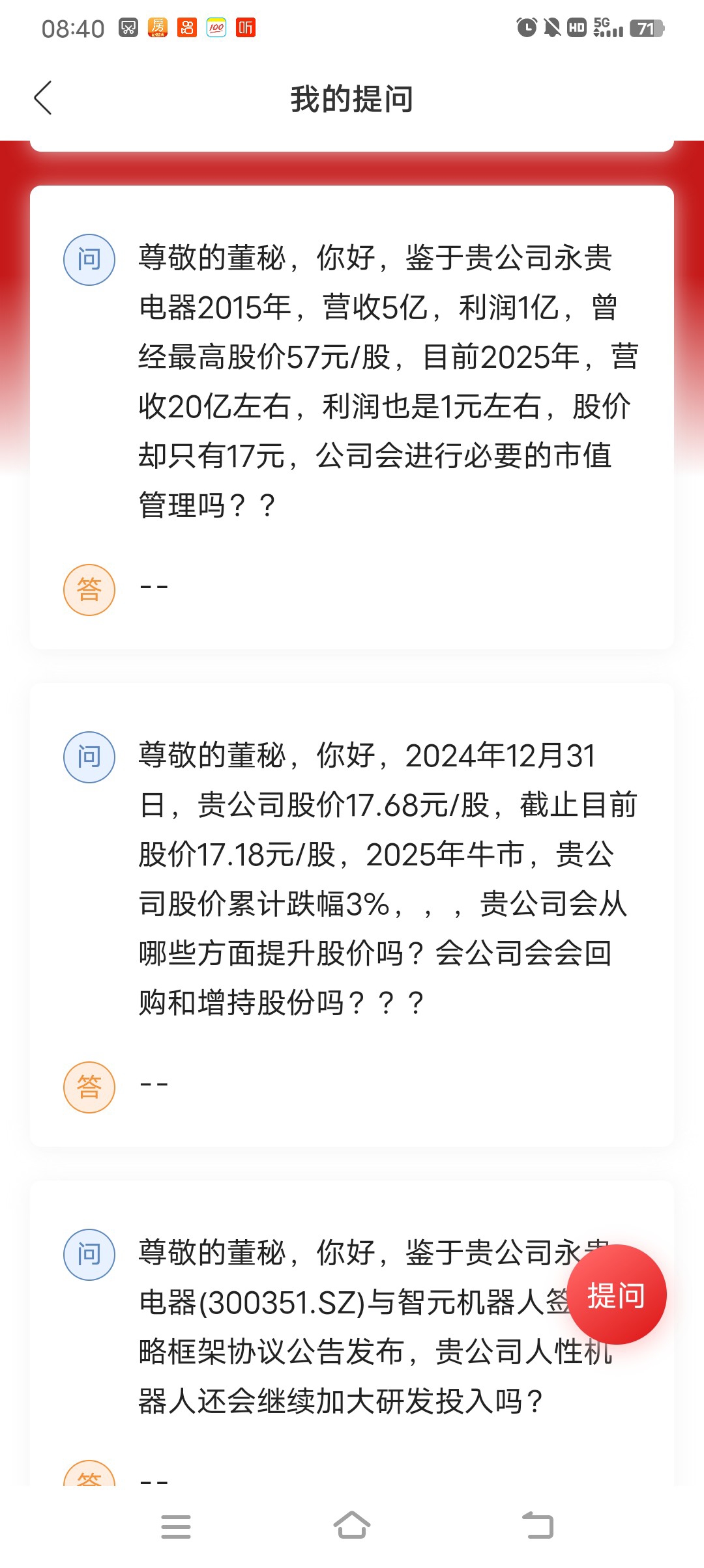 董秘还在吗?为何为了几个问题,一周多时间了,都没人回复??????平时发布公告利