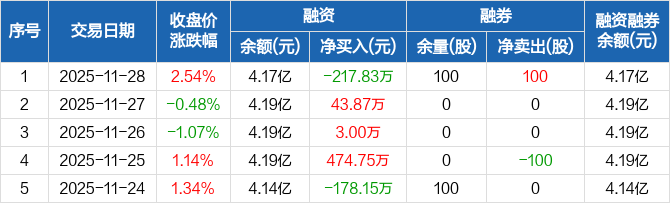 永贵电器:融资净偿还217.83万元,融资余额4.17亿元(11-28)