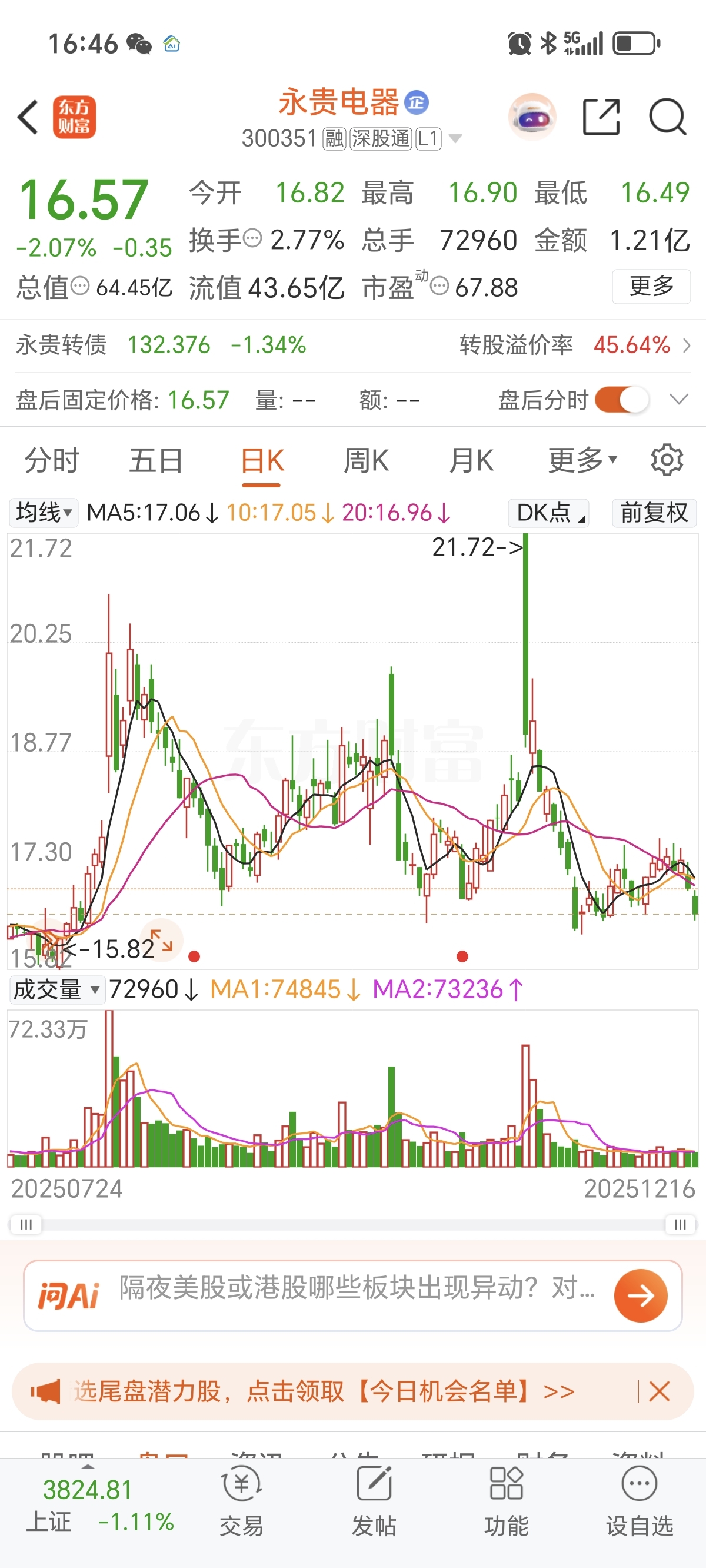 $永贵电器(SZ300351)$ 2天就把5天的涨幅干没了。明天继续下探。慢慢磨下去,千万不要涨,等我拿到工资来补仓