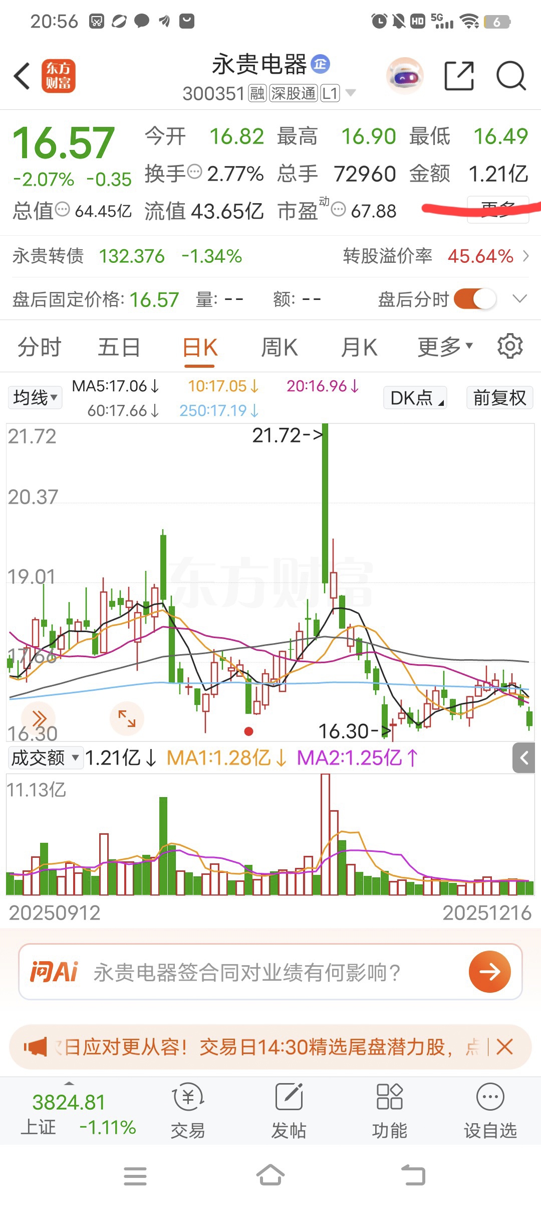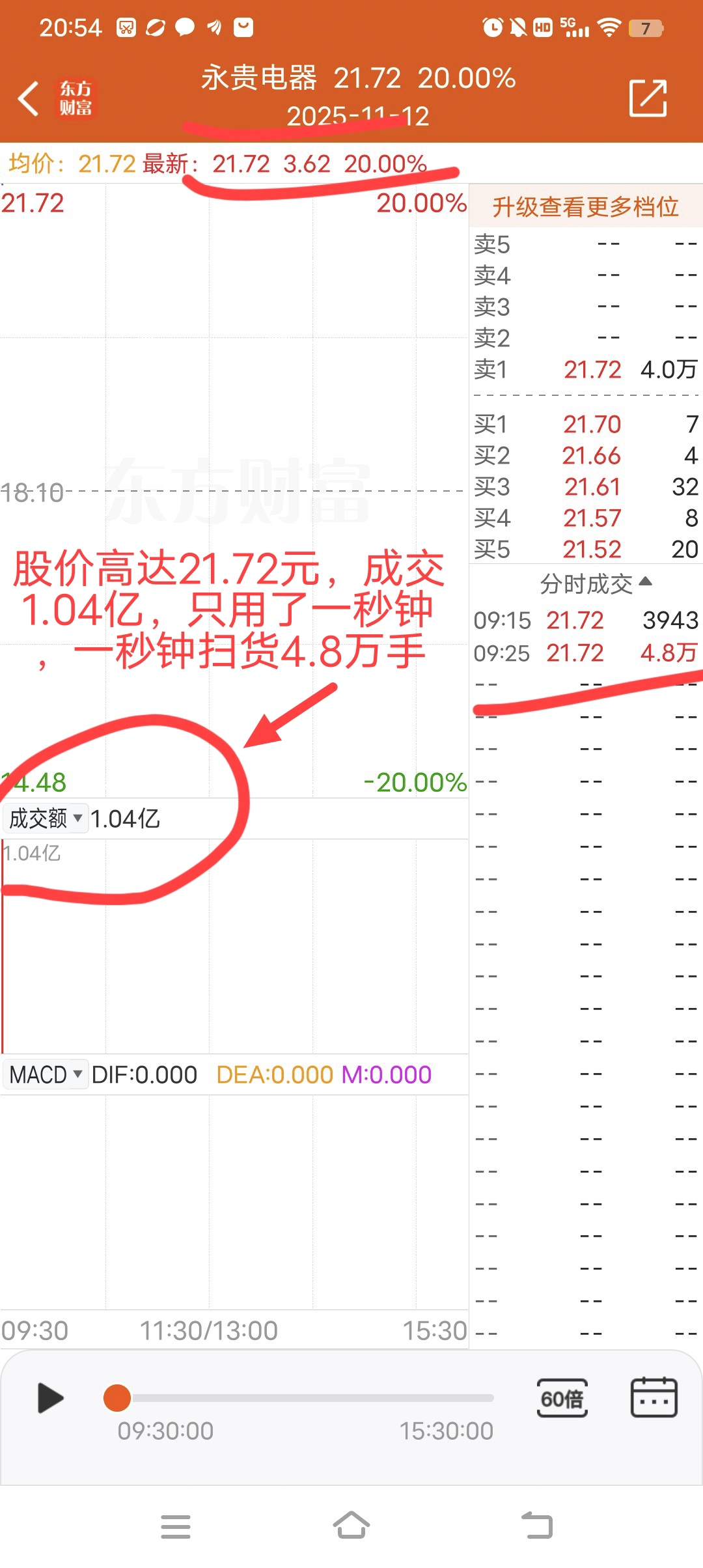 $永贵电器(SZ300351)$ 股价21.72元,梭哈1.04亿成交量,只用了1秒钟,哈哈哈,现在股价16.54元,成交量1.2亿,用了一天,,,野蛮人大哥们,还在山顶吹风吗?你们不扫货,根本没几个人敢买?还去倒车接人,你怕散户太少,出不了货吗?现在又去倒车,2026年,还不乖乖的给别人抬轿子拉60元价格,