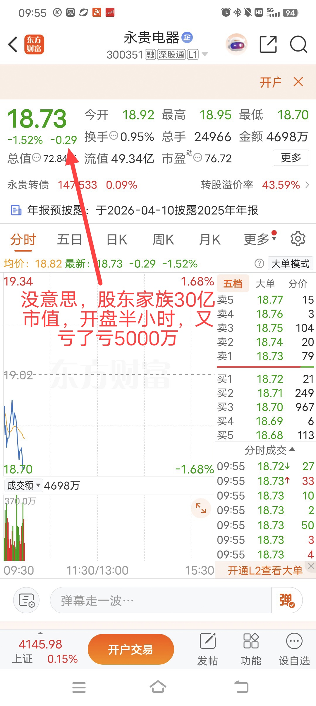 开盘不到半小时,股东家族就亏了快5000万,空头别太狠了,小心野蛮人出手做多,,
