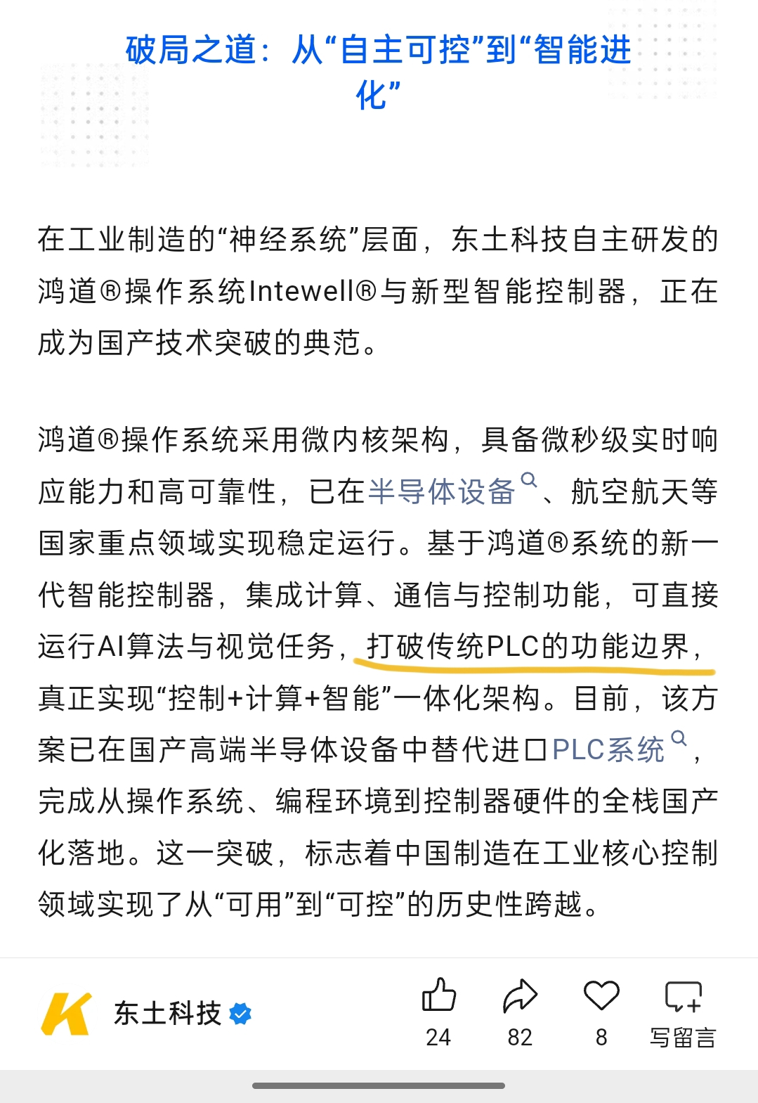 鸿道操作系统采用微内核架构,具备微秒级实时响应能力和高可靠性,已在半导体设备、航空航天等国家重点领域实现稳定运行。基于鸿道系统的新一代智能控制器,集成计算、通信与控制功能,可直接运行AI算法与视觉任务,打破传统PLC的功能边界,真正实现“控制+计算+智能”一体化架构。目前,该方案已在国产高端半导体设备中替代进口PLC系统,完成从操作系统、编程环境到控制器硬件的全栈国产化落地。这一突破,标志着中国制造在工业核心控制领域实现了从“可用”到“可控”的历史性跨越。