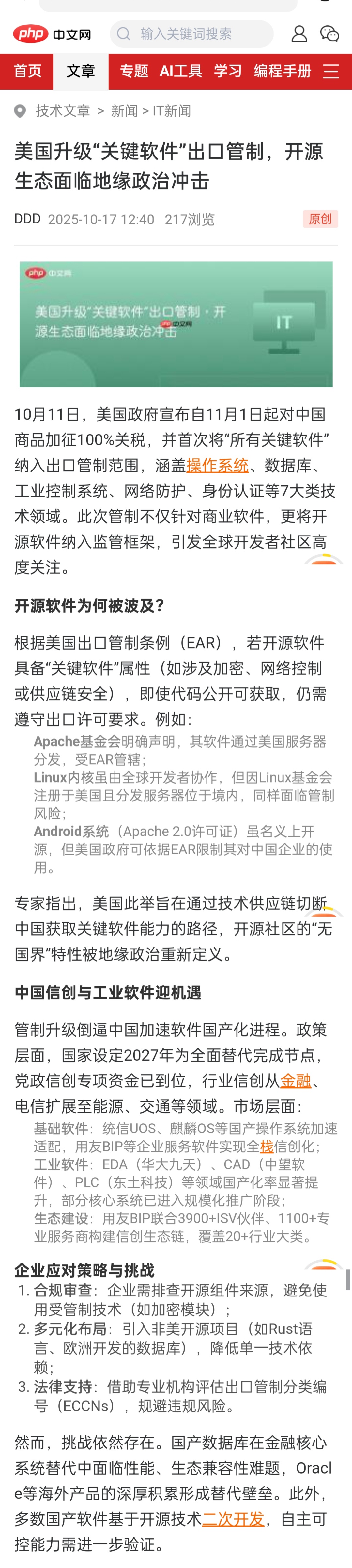 该网站10月17日发表《美国升级“关键软件“出口管制,开源生态面临地缘政治冲击》一文。文章指出开源软件为何被波及(注:Linux内核是美国开源软件),明确Linux内核“面临管制风险“(那么麒麟统信欧拉将面临风险)。但是对于Linux内核上二次开发的统信、麒麟OS,文章却说“加速适配”,思想混乱,应该是一个笔误。