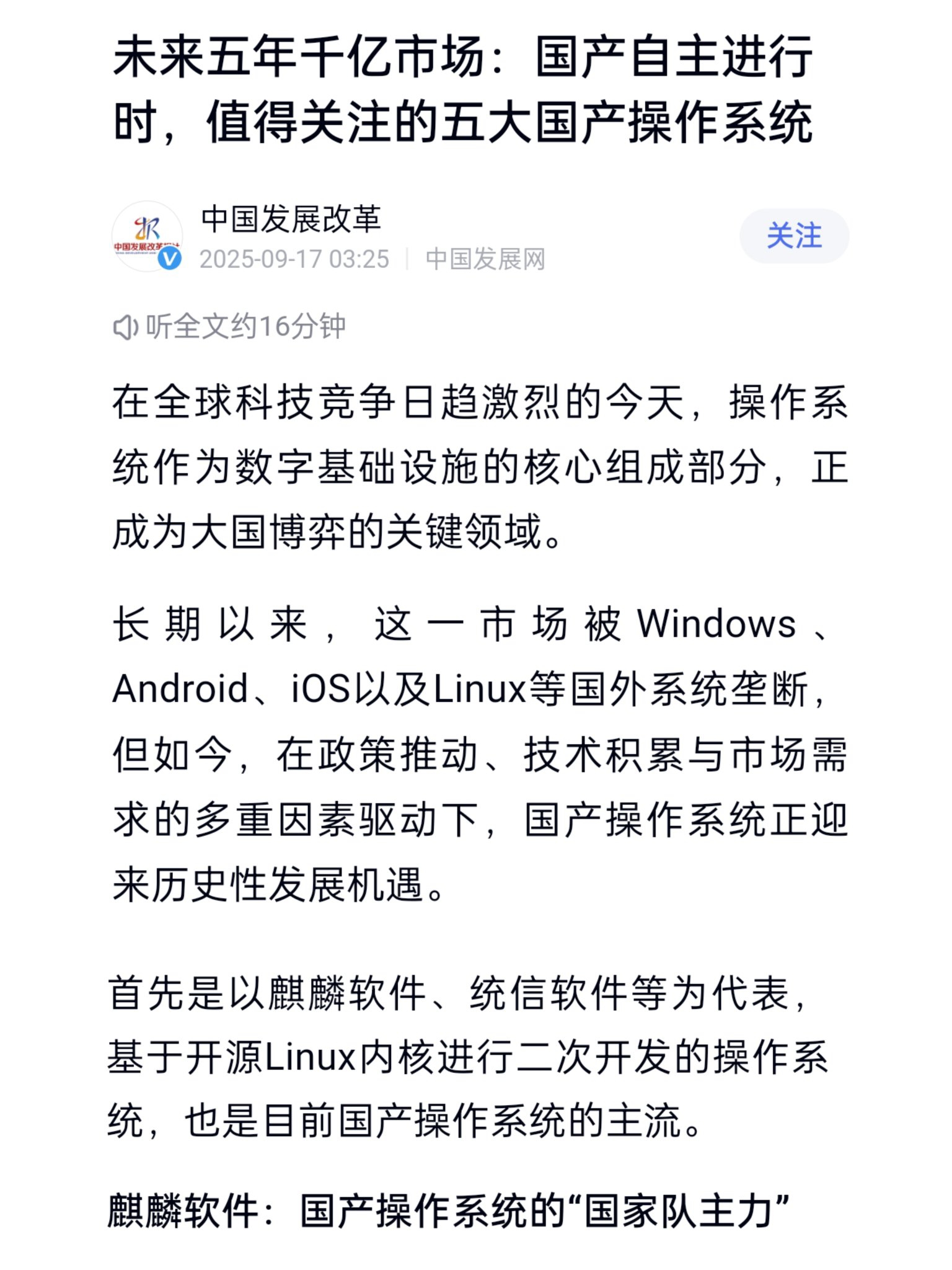 2025年9月17日国家发改委直属的“中国发展改革报社”发表了《未来五年千亿市场:国产自主进行时,值得关注的五大国产操作系统》一文。文章首先肯定,以麒麟软件、统信软件等为代表,基于开源Linux内核进行二次开发的操作系统,是目前国产操作系统的主流。文章提到,麒麟操作系统(麒麟OS)是国产操作系统的“国家队主力”。麒麟OS在政府单位广泛使用,市占率约85%,统信OS在党政、金融等领域占有较高市场份额。[国家层面的认知也出现了偏差]