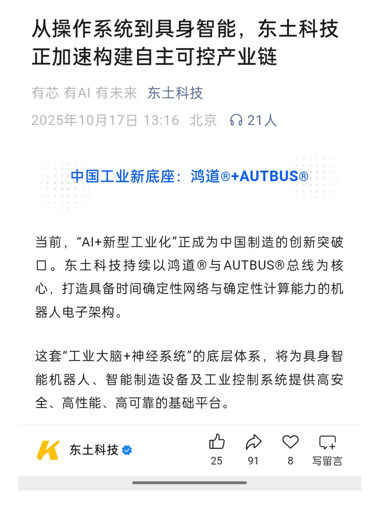 当前,“AI+新型工业化”正成为中国制造的创新突破口。东土科技持续以鸿道与AUTBUS总线为核心,打造具备时间确定性网络与确定性计算能力的机器人电子架构。