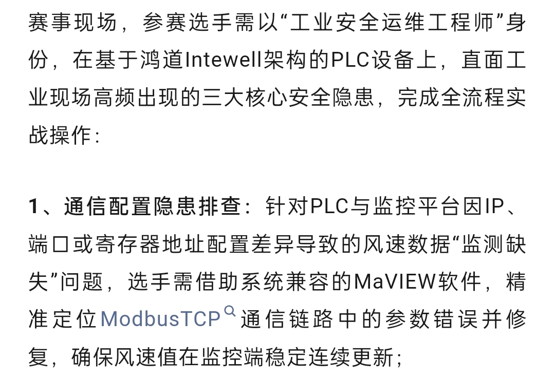 第九届工业信息安全技能大赛全国总决赛上,参赛选手需在基于[东土科技]鸿道Intewell操作系统的PLC设备上,完成通信隐患排查、控制逻辑修正、异常数据识别等实战操作。其中,选手需借助系统兼容的[东土科技]MaVIEW软件,确保风速值在监控端稳定连续更新。
