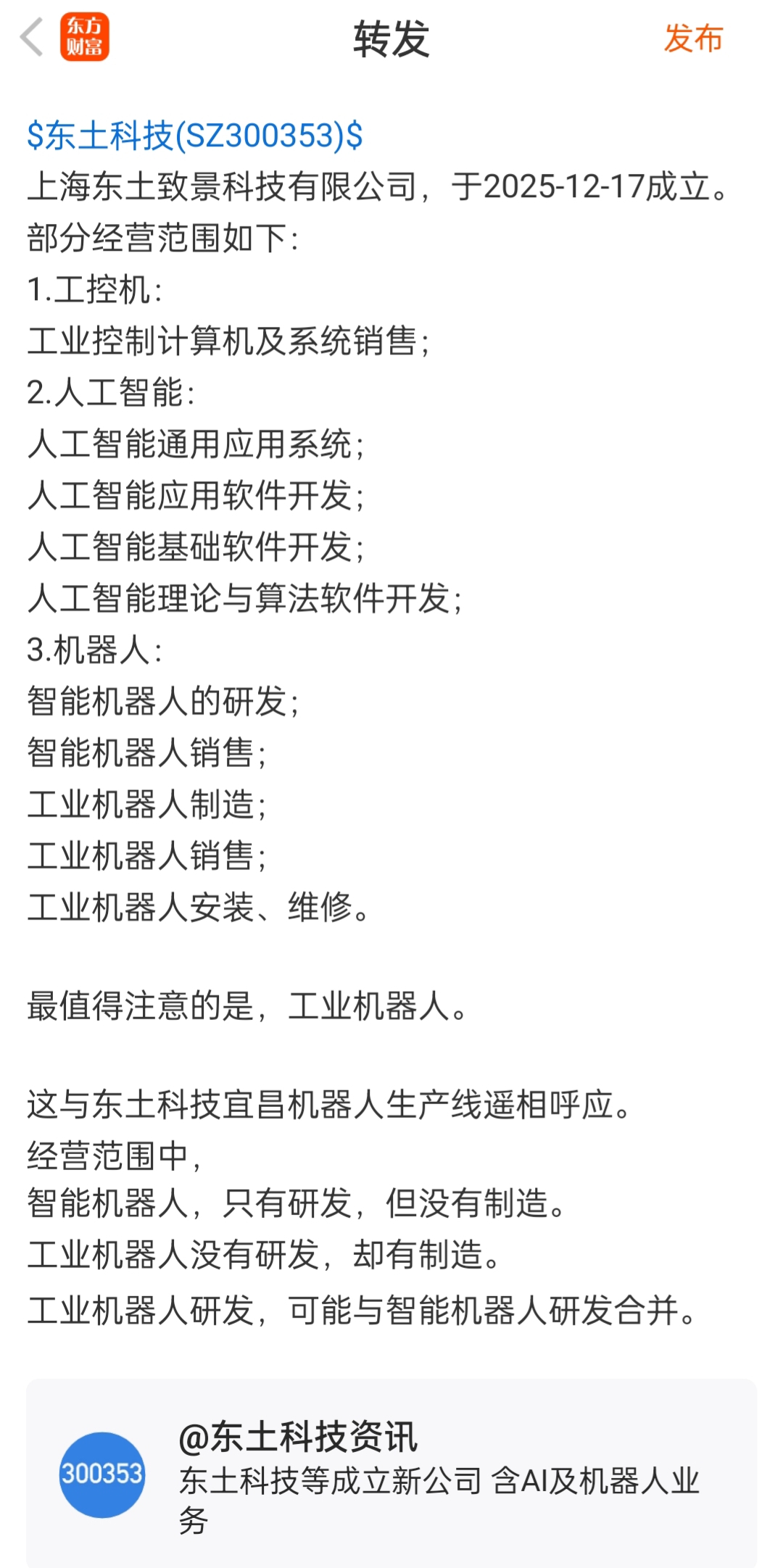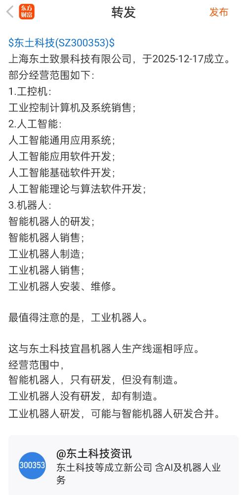 企查查APP显示,近日,上海东土致景科技有限公司成立,注册资本1000万元,经营范围包含智能机器人的研发;智能机器人销售;人工智能应用软件开发;人工智能基础软件开发;人工智能理论与算法软件开发等。企查查股权穿透显示,该公司由东土科技等共同持股。
