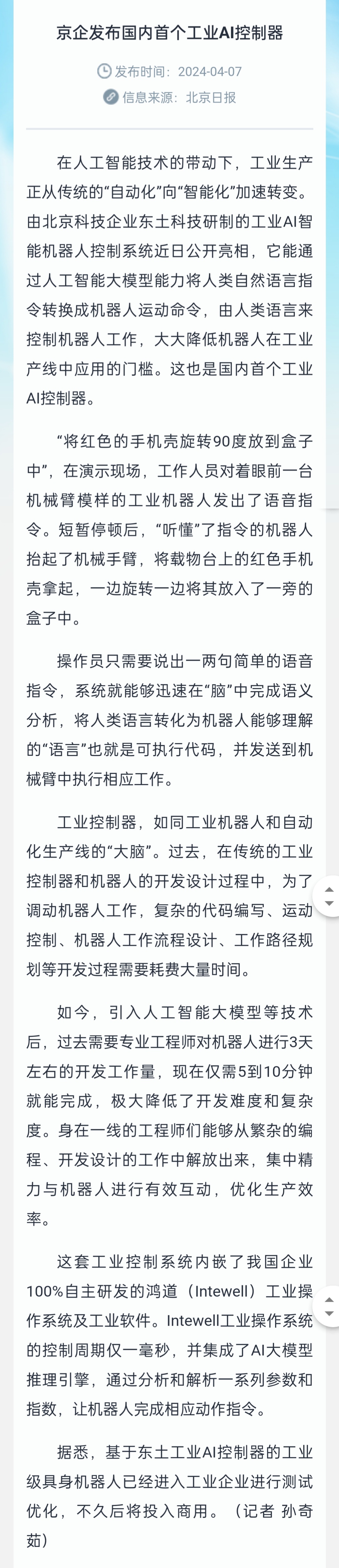 北京日报的这篇报道,讲清楚了,东土科技发布的国内首个工业AI控制器完成的人类语言