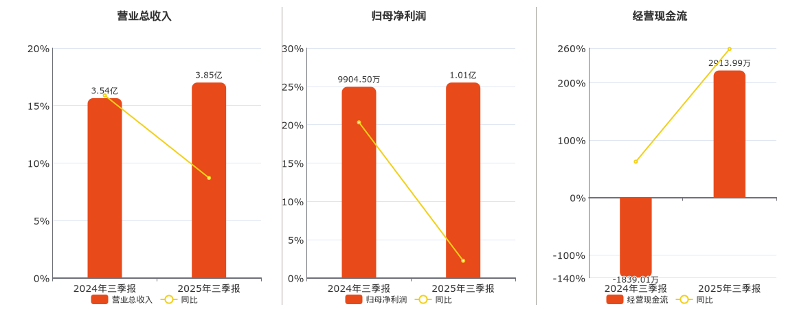 公司营业总收入为3.85亿元。归母净利润为1.01亿元。经营活动现金净流入为2913.99万元。