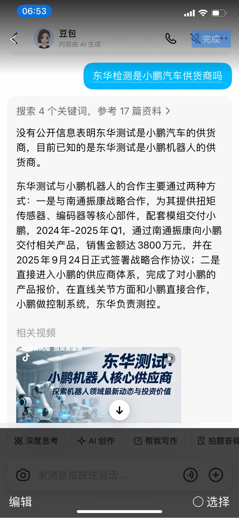 豆包求证东华确实是小鹏机器人供货商,是直接合作伙伴。