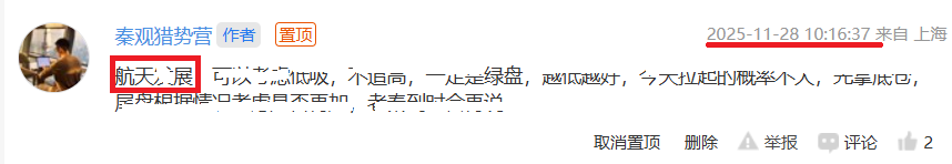 $航天发展(SZ000547)$早评里给出唯一观察目标,收盘涨停。更可贵的是竟然给了绿盘低吸的机会。老秦早盘只是拿了底苍,认为拉升要到下周一,结果尾盘就一波冲涨上板了,手忙脚乱的又加了一些,真是计划不如变化快。不过无论怎样,一起上船的朋友,都是日内大禸了。没敢加的朋友也不用急,预计周一正常还能加。大家不想错失下次的上船时刻,可以去看老秦的置顶帖子重要通知。老秦周一就要停更并把重心放在新阵地了,我也准备了一个至少20cm大米票在下周二分享到营里的兄弟。
