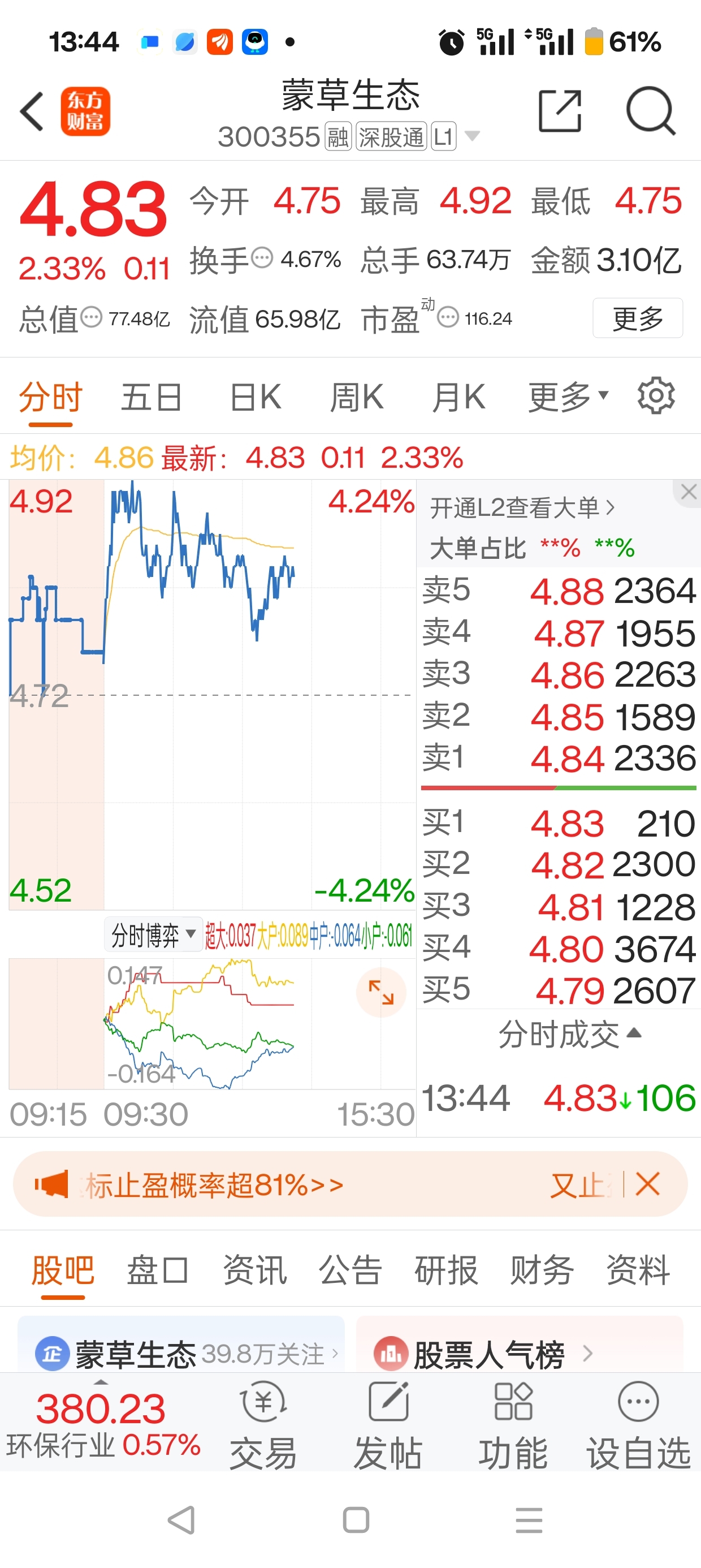 $蒙草生态(SZ300355)$ 4.84,下午拉高到均线上方,坚决卖出或者尾市卖出
