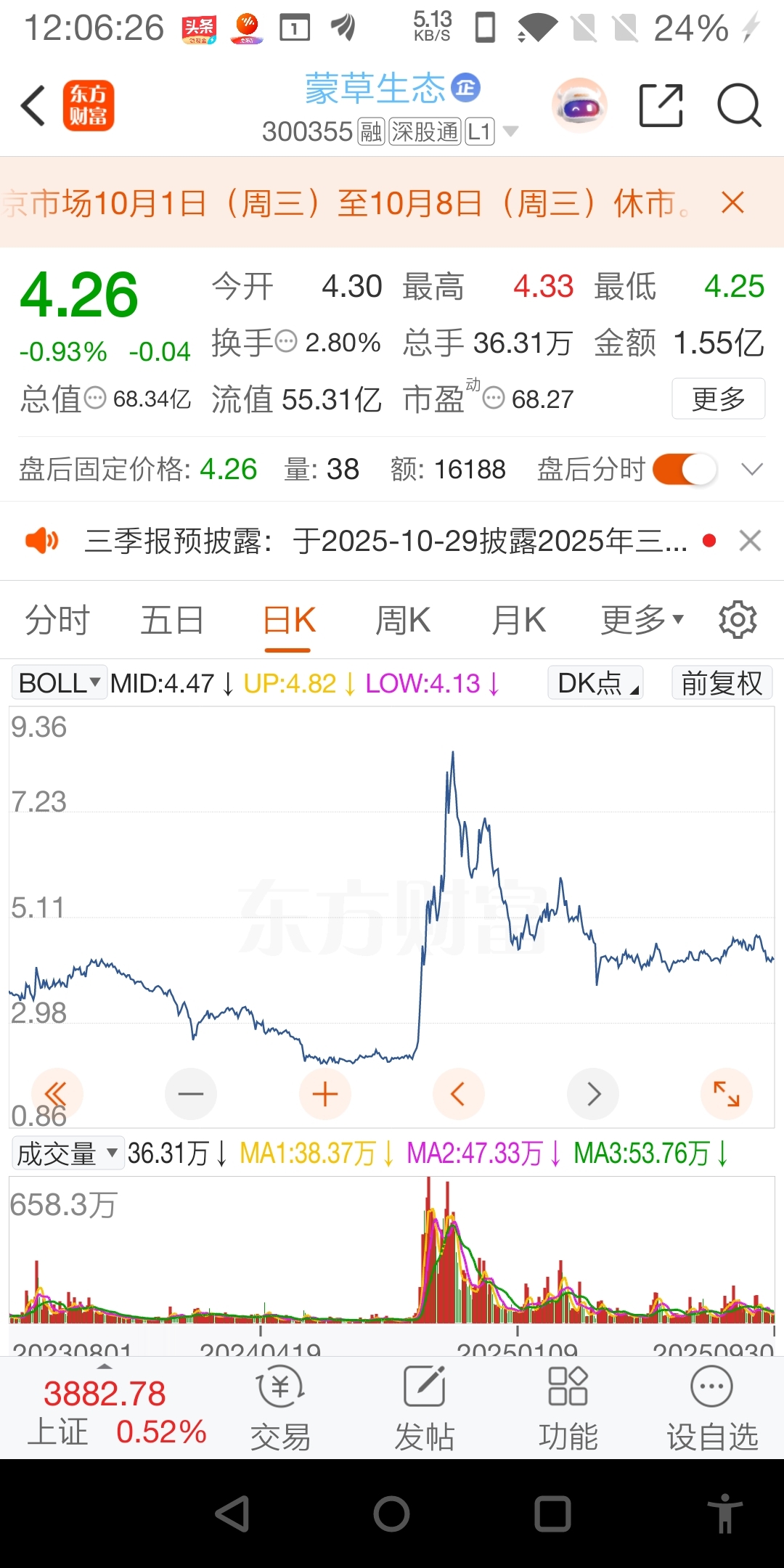 $蒙草生态(SZ300355)$ 平衡位置在4.3,前期很多合同的业绩体现在明年。战略上可以开始考虑介入。具体的,等看了图才行一定要看细节,看到一分钟线。