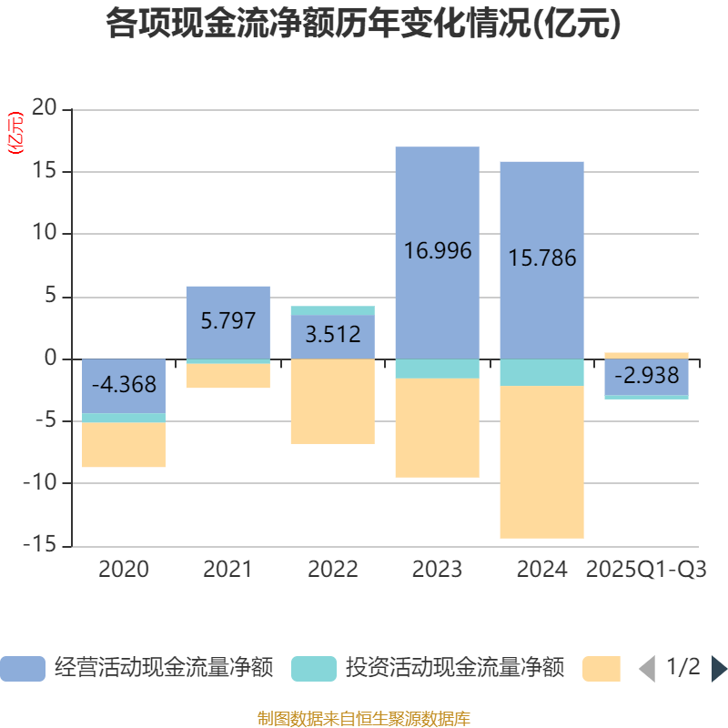 2025年前三季度,公司经营活动现金流净额为-2.94亿元,同比减少4.18亿元;筹资活动现金流净额4927.41万元,同比增加5.28亿元;投资活动现金流净额-3167.68万元,上年同期为-2.28亿元。