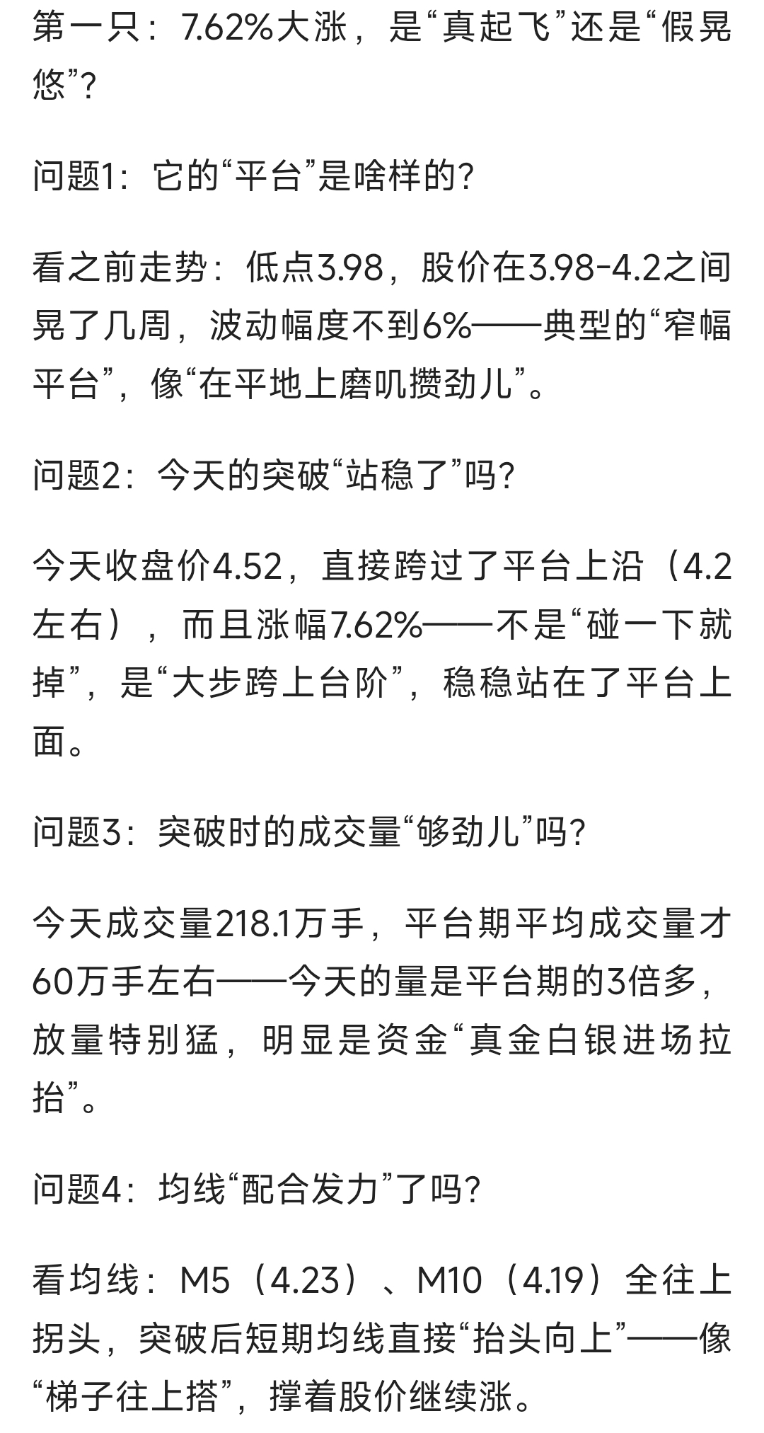 不是冲高碰一下平台上沿就掉下来(那是“假突破”),得是收盘价站稳平台上沿,最好连续1-2天在平台上方——像“踩稳台阶再往上走”,才是真发力。